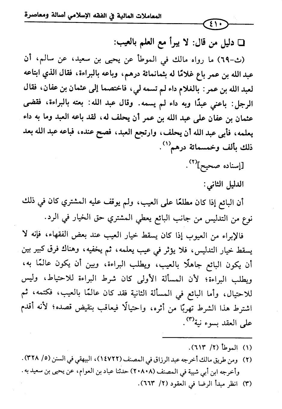 (ث -٦٩) ما رواه مالك في الموطأ عن يحيى بن سعيد، عن سالم، أن عبد الله بن عمر باع غلامًا له بثمانمائة درهم، وباعه بالبراءة، فقال الذي ابتاعه لعبد الله بن عمر: بالغلام داء لم تسمه لي، فاختصما إلى عثمان بن عفان، فقال الرجل: باعني عبدًا وبه داء لم يسمه. وقال عبد الله: بعته بالبراءة، فقضى عثمان بن عفان على عبد الله بن عمر أن يحلف له، لقد باعه العبد وما به داء يعلمه، فأبى عبد الله أن يحلف، وارتجع العبد، فصح عنده، فباعه عبد الله بعد ذلك بألف وخمسمائة درهم (¬١).