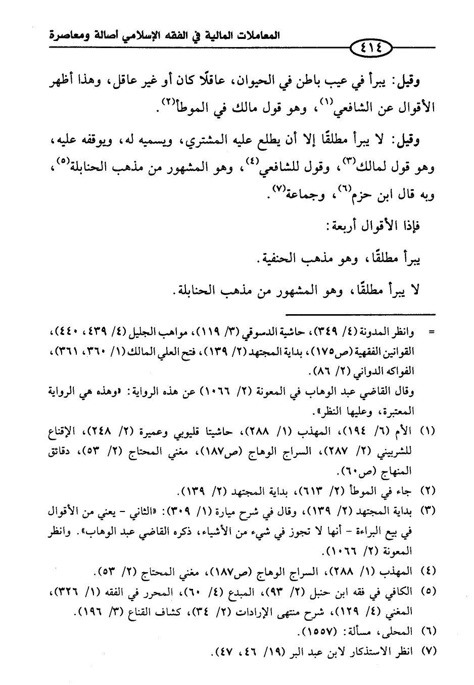 (¬٣) بداية المجتهد (٢/ ١٣٩)، وقال في شرح ميارة (١/ ٣٠٩): "الثاني -يعني من الأقوال في بيع البراءة- أنها لا تجوز في شيء من الأشياء، ذكره القاضي عبد الوهاب". وانظر المعونة (٢/ ١٠٦٦).