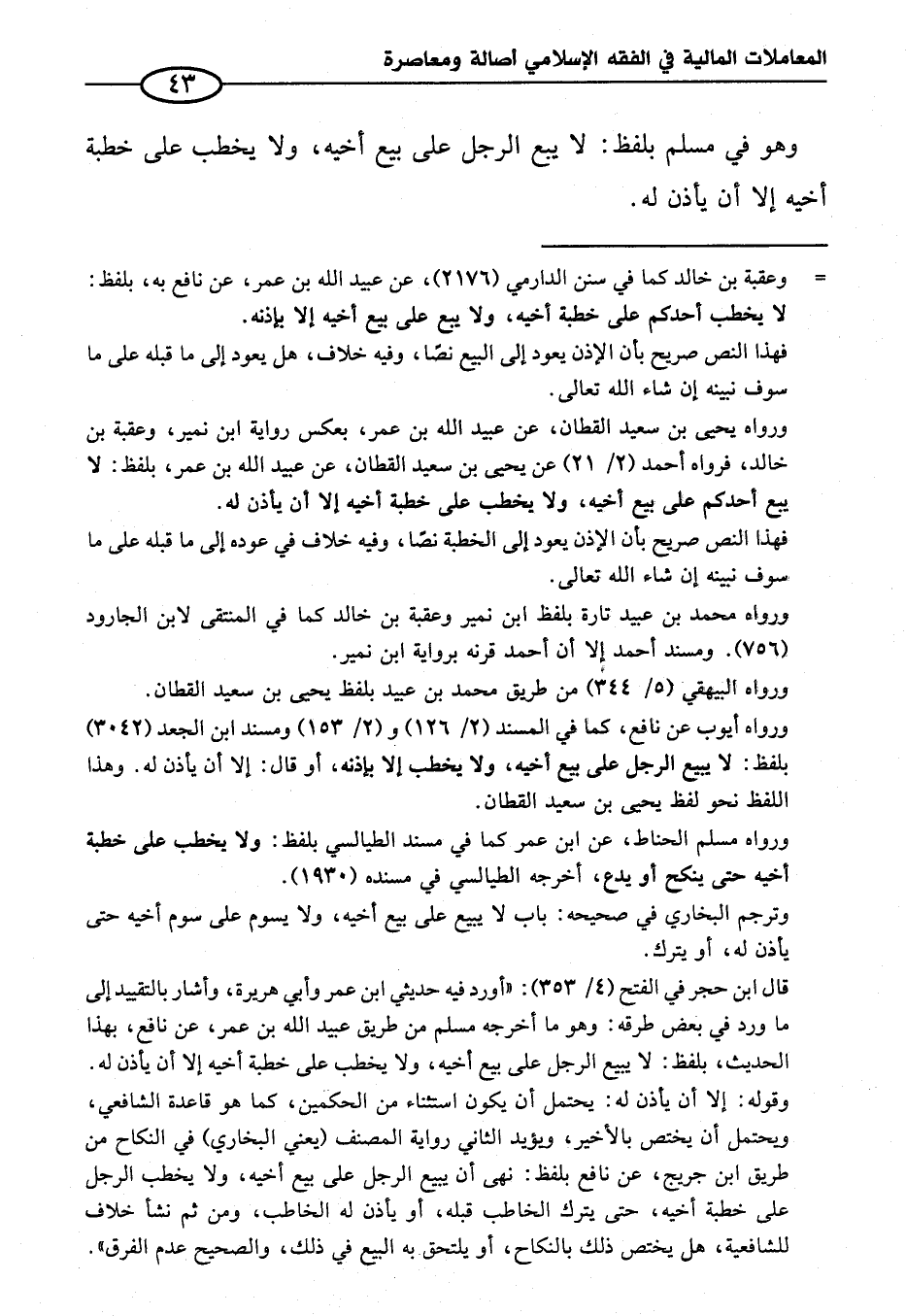= وعقبة بن خالد كما في سنن الدارمي (٢١٧٦)، عن عبيد الله بن عمر، عن نافع به، بلفظ: لا يخطب أحدكم على خطبة أخيه، ولا يبع على بيع أخيه إلا بإذنه.