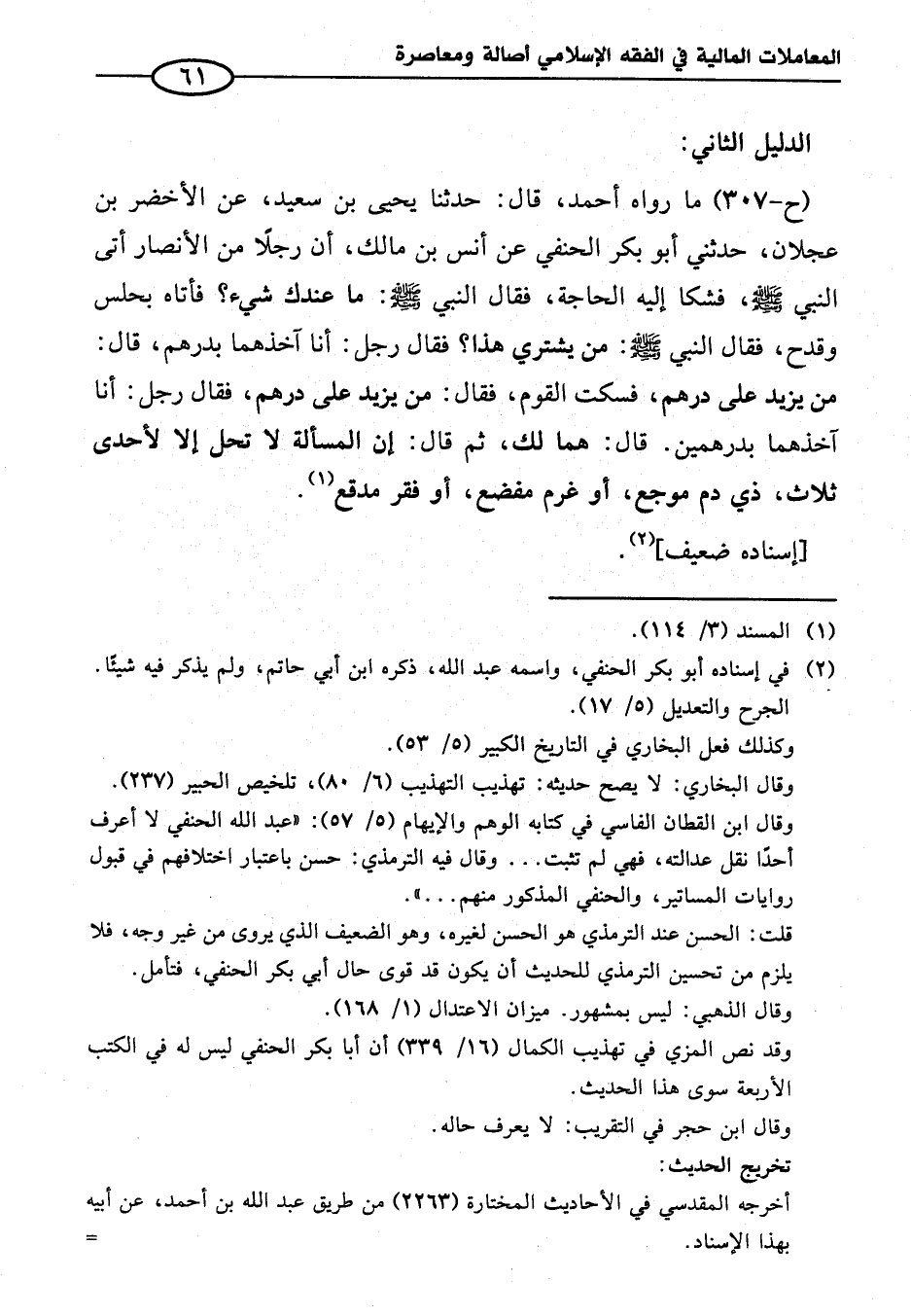 (ح-٣٠٧) ما رواه أحمد، قال: حدثنا يحيى بن سعيد، عن الأخضر بن عجلان، حدثني أبو بكر الحنفي عن أنس بن مالك، أن رجلاً من الأنصار أتى النبي - صلى الله عليه وسلم -، فشكا إليه الحاجة، فقال النبي - صلى الله عليه وسلم -: ما عندك شيء؟ فأتاه بحلس وقدح، فقال النبي - صلى الله عليه وسلم -: من يشتري هذا؟ فقال رجل: أنا آخذهما بدرهم، قال: من يزيد على درهم، فسكت القوم، فقال: من يزيد على درهم، فقال رجل: أنا آخذهما بدرهمين. قال: هما لك، ثم قال: إن المسألة لا تحل إلا لأحدى ثلاث، ذي دم موجع، أو غرم مفضع، أو فقر مدقع (¬١).