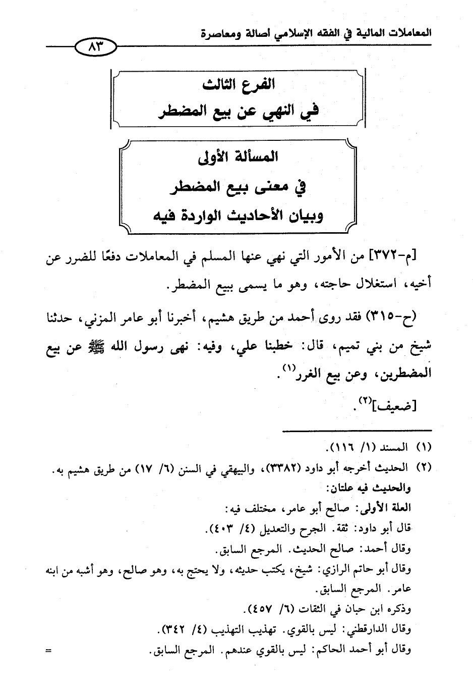 (ح-٣١٥) فقد روى أحمد من طريق هشيم، أخبرنا أبو عامر المزني، حدثنا شيخ من بني تميم، قال: خطبنا علي، وفيه: نهى رسول الله - صلى الله عليه وسلم - عن بيع المضطرين، وعن بيع الغرر (¬١).