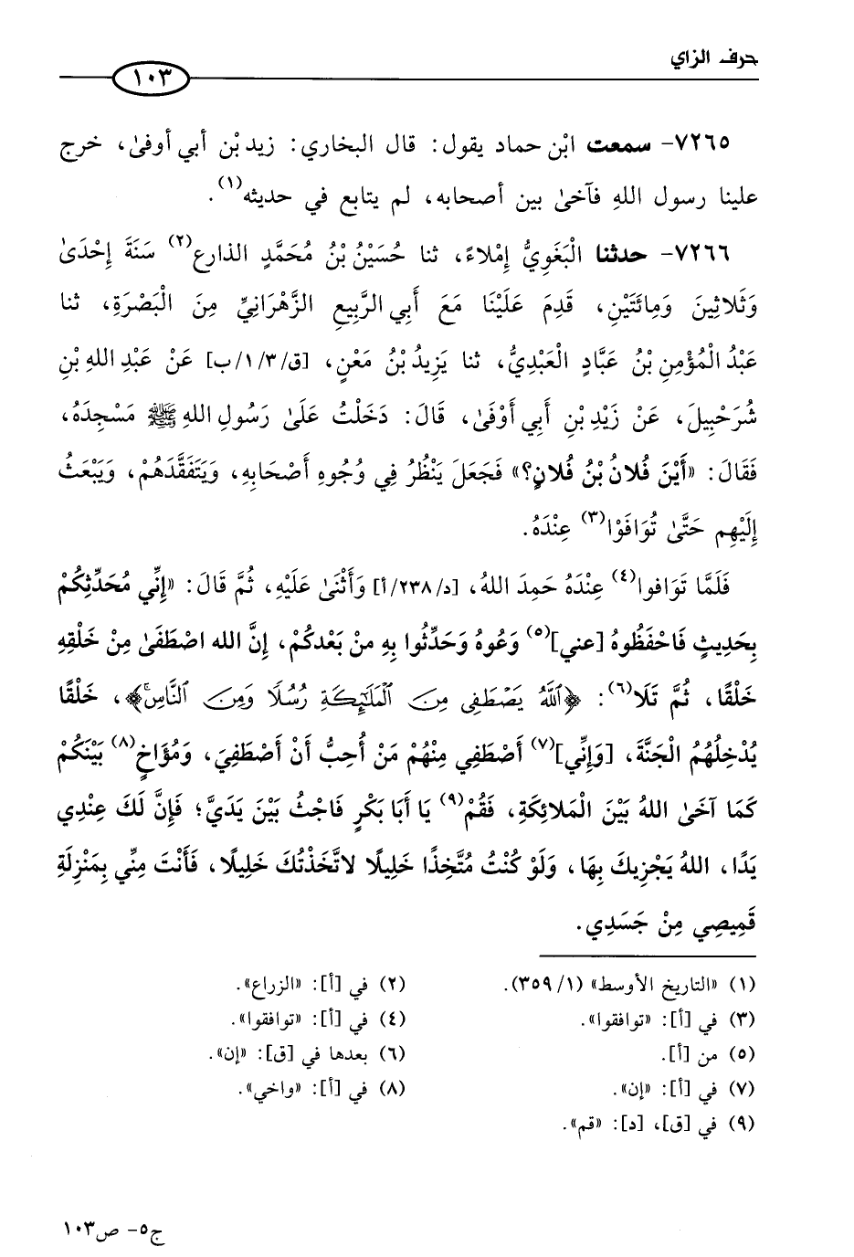 7265 - سمعتُ ابن حماد يقول: قال البُخاري: زيد بن أبي أوفى؛ خرج علينا رسول الله صَلى الله عَليه وسَلم فآخى بين أصحابه. لم يتابع في حديثه.