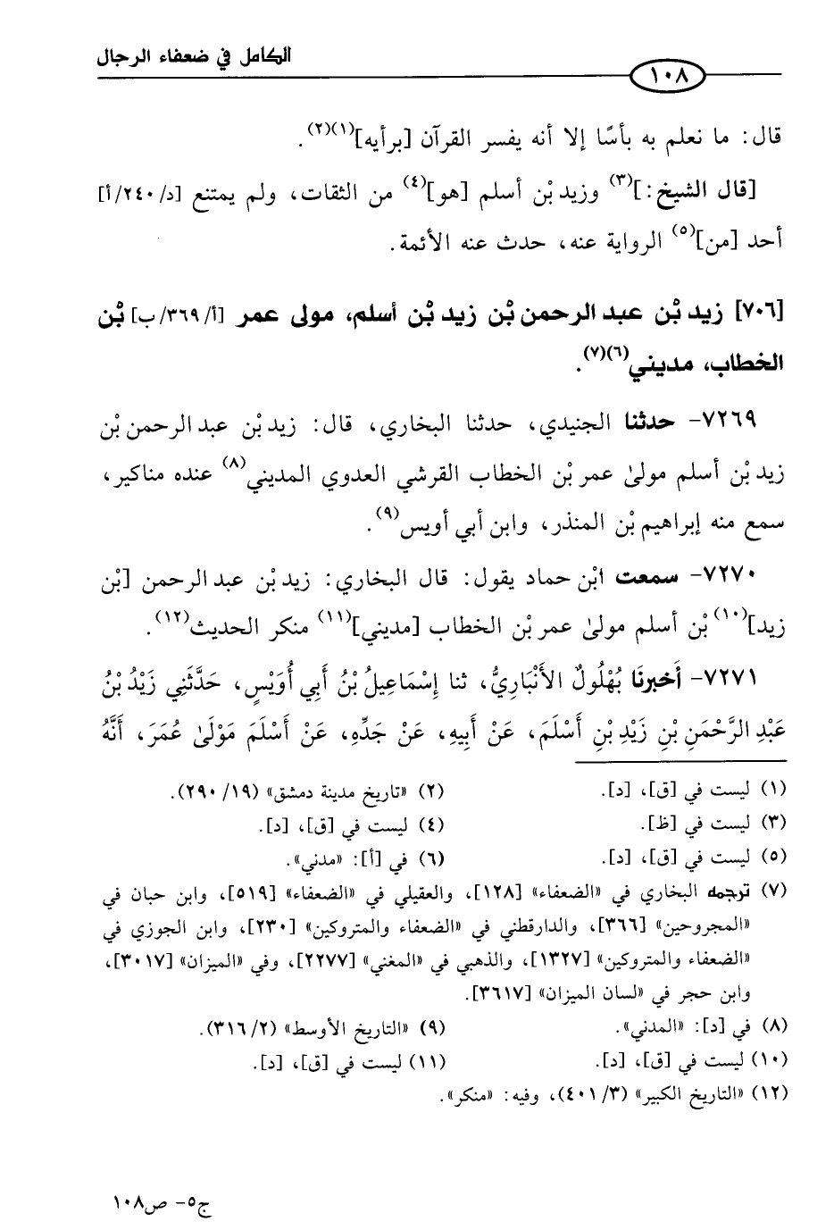 7269 - حَدثنا الجنيدي، حَدثنا البُخاري قال: زيد بن عَبد الرحمن بن زيد بن أسلم مولى عُمر بن الخطاب القرشي العدوي المديني، عنده مناكير سمع منه إبراهيم بن المنذر، وابن أبي أويس.