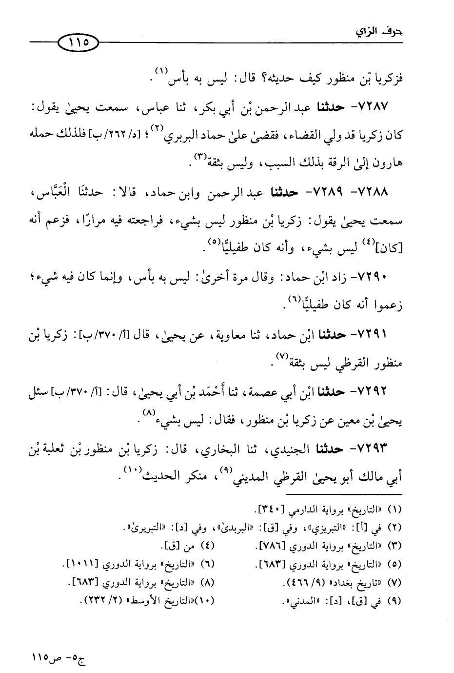 7291 - حَدثنا ابن حماد، حَدثنا معاوية، عن يحيى، قال: زكريا بن منظور القرظي ليس بثقة.