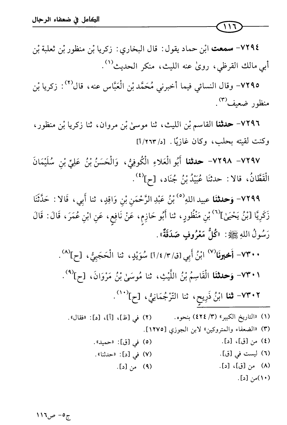 7294 - سمعتُ ابن حماد يقول: قال البُخاري: زكريا بن منظور بن ثعلبة بن أبي مالك القرظي، روى عنه الليث منكر الحديث.