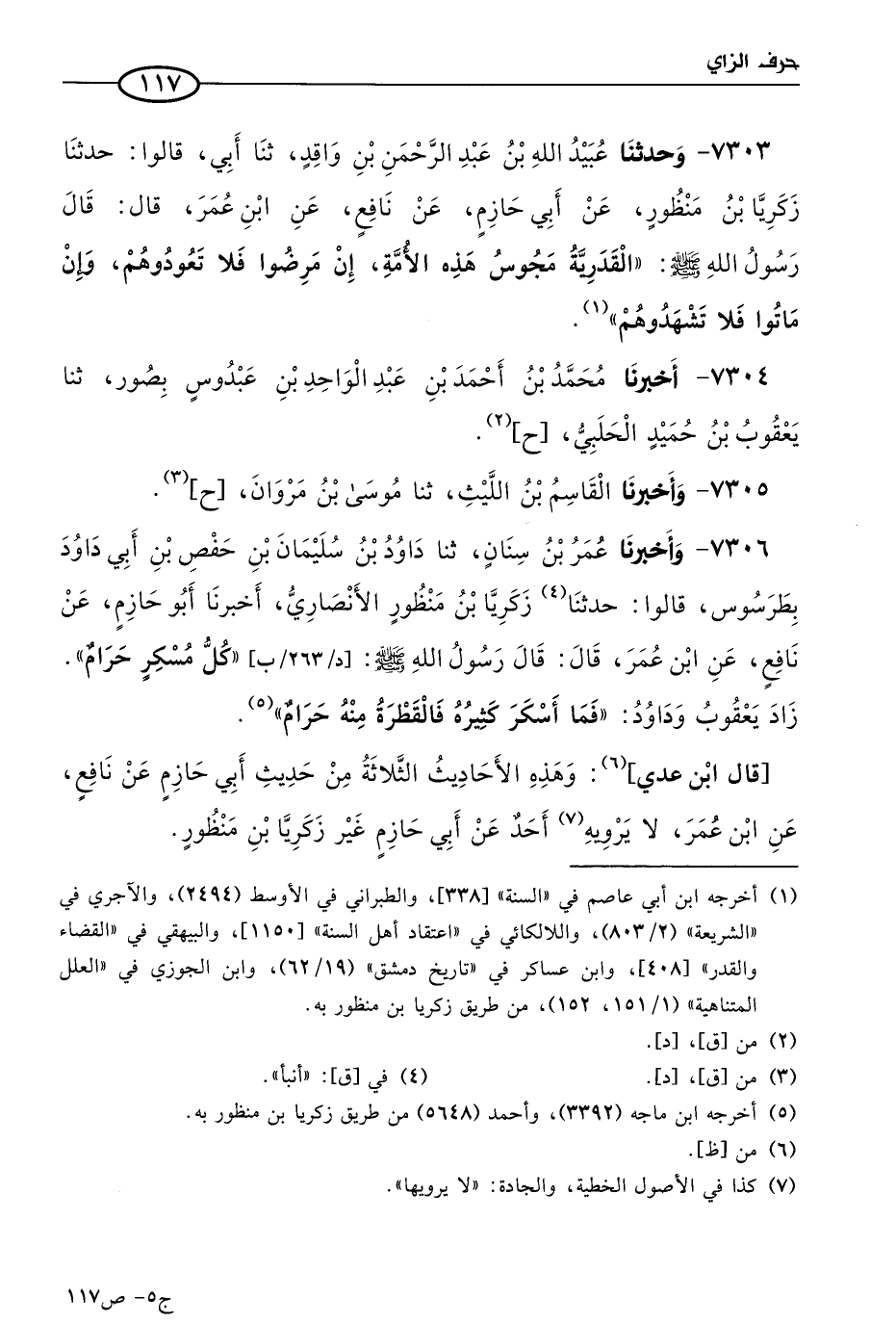 7306 - وأخبرنا عُمر بن سنان، حَدثنا داود بن سليمان بن حفص بن أبي داود بطرسوس، قالوا: حَدثنا زكريا بن منظور الأنصاري، أخبرنا أَبو حازم، عن نافع، عن ابن عُمر، قال: قال رسول الله صَلى الله عَليه وسَلم: كل مسكر حرام.