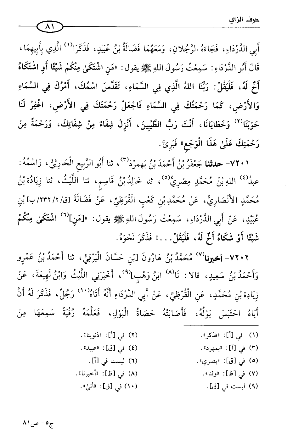 7201 - حَدثنا جعفر بن أحمد بن بهمرد، حَدثنا أَبو الربيع الحارثي، واسمه عُبيد الله (1) بن مُحمد مصري، حَدثنا خالد بن قاسم، حَدثنا الليث، حَدثنا زيادة بن مُحمد الأنصاري، عن مُحمد بن كعب القرظي، عن فضالة بن عُبيد، عن أبي الدرداء، سمعت رسول الله صَلى الله عَليه وسَلم يقول: مَن اشتكى منكم شيئا، أو شكاه أخ له فليقل، فذكره نحوه.