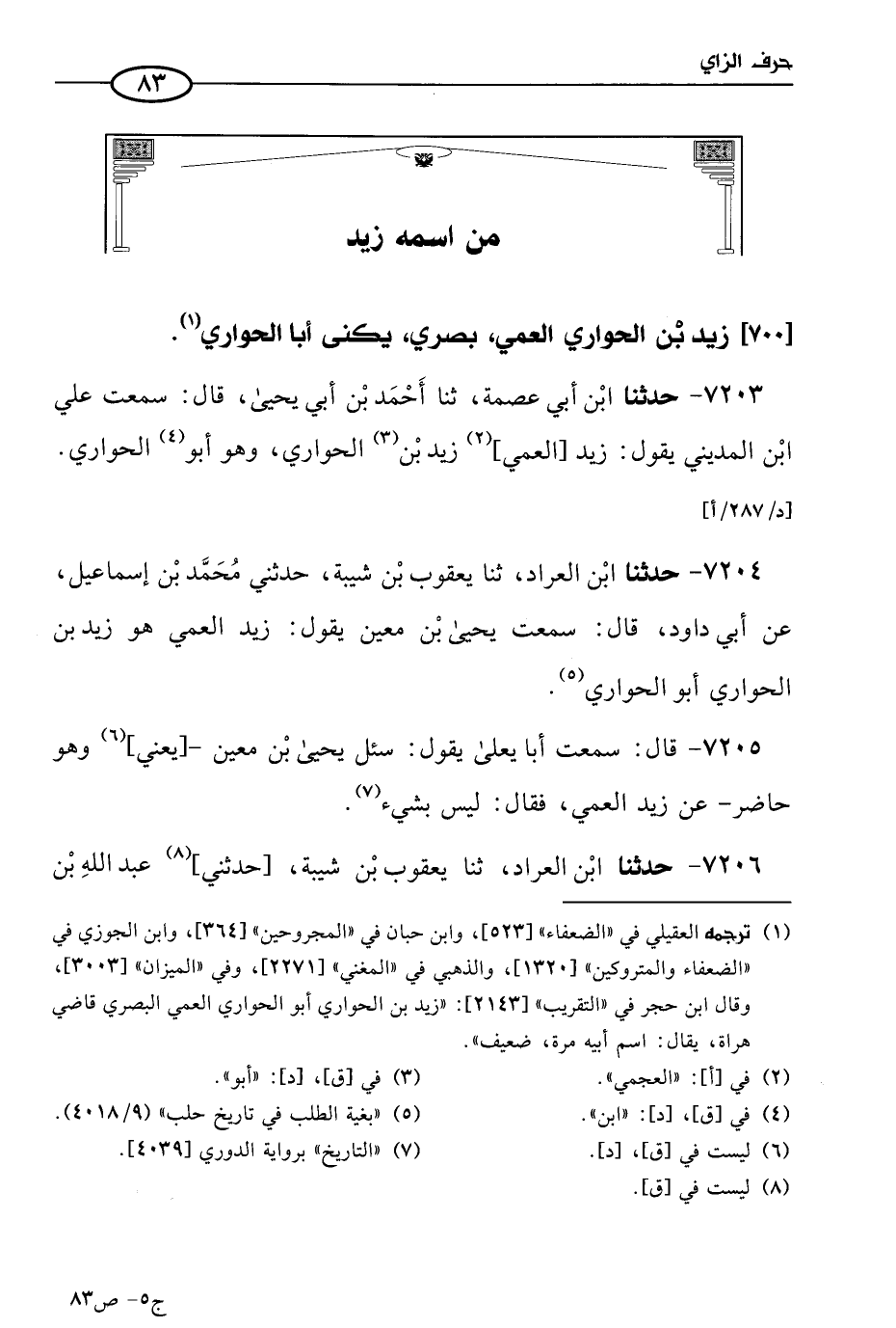 7204 - حَدثنا ابن العراد، حَدثنا يعقوب بن شيبة، حَدَّثني مُحمد بن إسماعيل، عن أبي داود، قال: سمعتُ يحيى بن مَعين يقول: زيد العمي هو زيد بن الحواري أَبو الحواري.