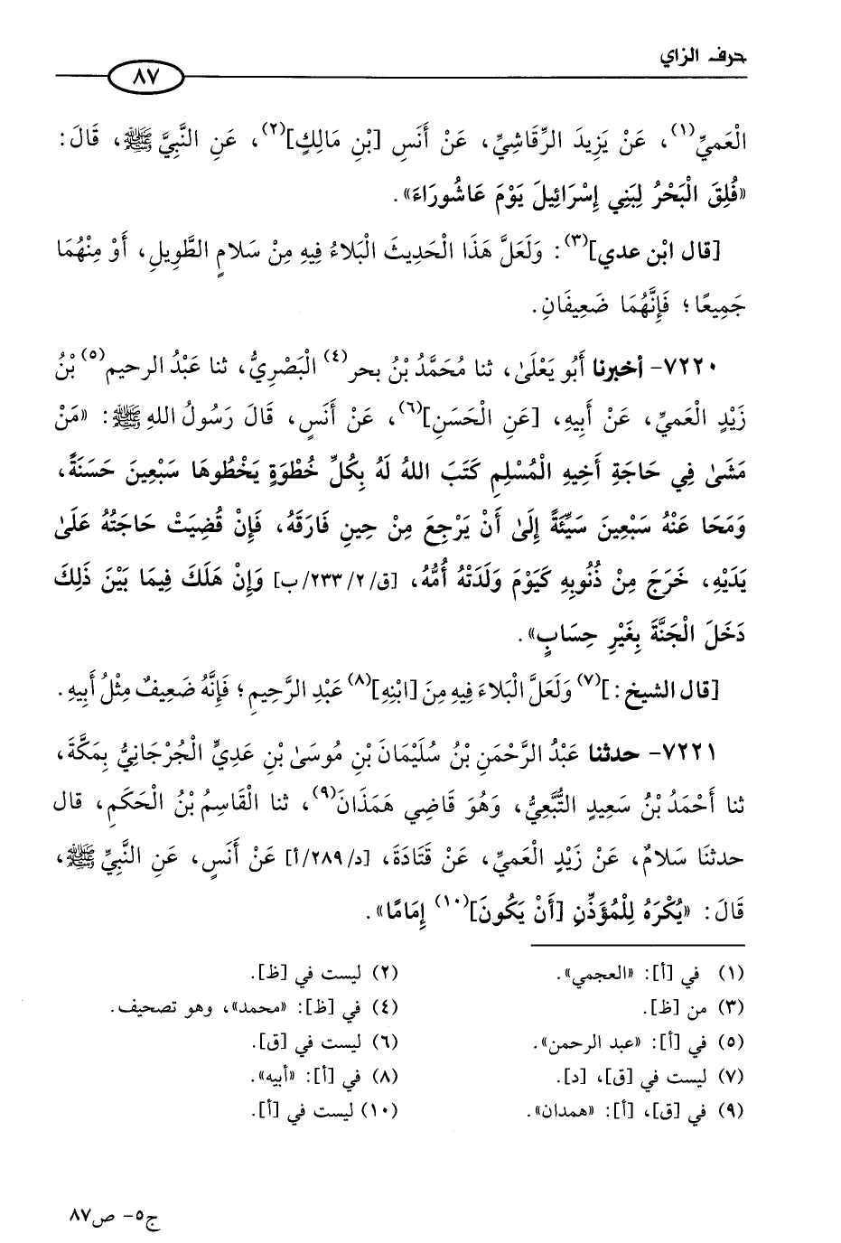 7220 - أخبرنا أَبو يعلَى، حَدثنا مُحمد بن مُحمد البصري، حَدثنا عَبد الرحيم بن زيد العمي، عن أبيه، عن الحسن، عن أَنَس، قال رسول الله صَلى الله عَليه وسلم: من مشى في حاجة أخيه المسلم كتب الله له بكل خطوة يخطوها سبعين حسنة، ومحا عنه سبعين سيئة، إلى أن يرجع من حين فارقه، فإن قضيت حاجته على يديه خرج من ذنوبه كيوم ولدته أُمه، وإن هلك فيما بين ذلك دخل الجنة بغير حساب.