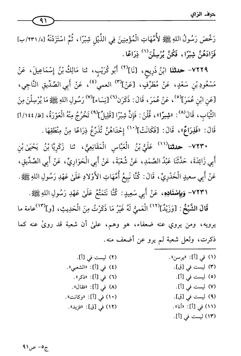 7229 - حَدثنا ابن ذريح، حَدثنا أَبو كريب، حَدثنا مالك بن إسماعيل، عن مسعود بن سعد، عن مطرف، عن العمي، عن أبي الصديق الناجي، عن ابن عُمر، عن عُمر، قال: ذكرن نساء رسول الله صَلى الله عَليه وسَلم ما يرسلن من الثياب، قال: شبرا، قلن: فإن شبرا قليل تخرج منه العورة، قال: فذراع، قال: فكانت أحداهن تذرع ذراعا من منطقها.