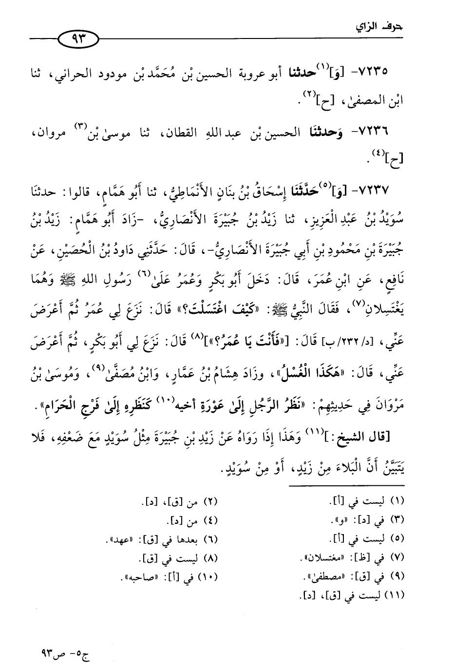7238 - 7239 - حَدثنا الحسين بن إبراهيم السكوني الحِمصي، والحُسَين بن عَبد الله بن يزيد، قالا: حَدثنا يحيى بن عثمان، حَدثنا مُحمد بن حميد، قال: وحَدَّثنا زيد بن جبيرة الأنصاري عن داود بن حصين عن نافع، عن ابن عُمر عن رسول الله صَلى الله عَليه وسَلم؛ خصال لا ينبغي في المساجد: فلا يتخذ طرقا، ولا يشهر فيه سلاح، ولا ينتثر فيه بقوس، ولا ينشر فيه نبل، ولا يمر فيه بلحم، ولا يضرب فيه حد، ولا يقص فيه جراحة، ولا يتخذ سوقا.