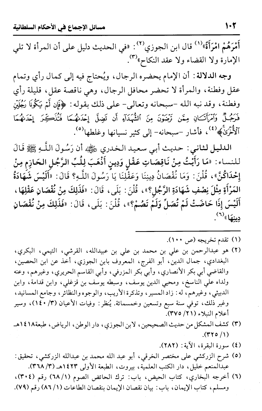 • وجه الدلالة: أن الإمام يحضره الرجال، ويُحتاج فيه إلى كمال رأي وتمام عقل وفطنة، والمرأة لا تحضر محافل الرجال، وهي ناقصة عقل، قليلة رأي وفطنة، وقد نبه اللَّه -سبحانه وتعالى- على ذلك بقوله: {فَإِنْ لَمْ يَكُونَا رَجُلَيْنِ فَرَجُلٌ وَامْرَأَتَانِ مِمَّنْ تَرْضَوْنَ مِنَ الشُّهَدَاءِ أَنْ تَضِلَّ إِحْدَاهُمَا فَتُذَكِّرَ إِحْدَاهُمَا الْأُخْرَى} (¬4)، فأشار -سبحانه- إلى كثير نسيانها وغلطها (¬5).