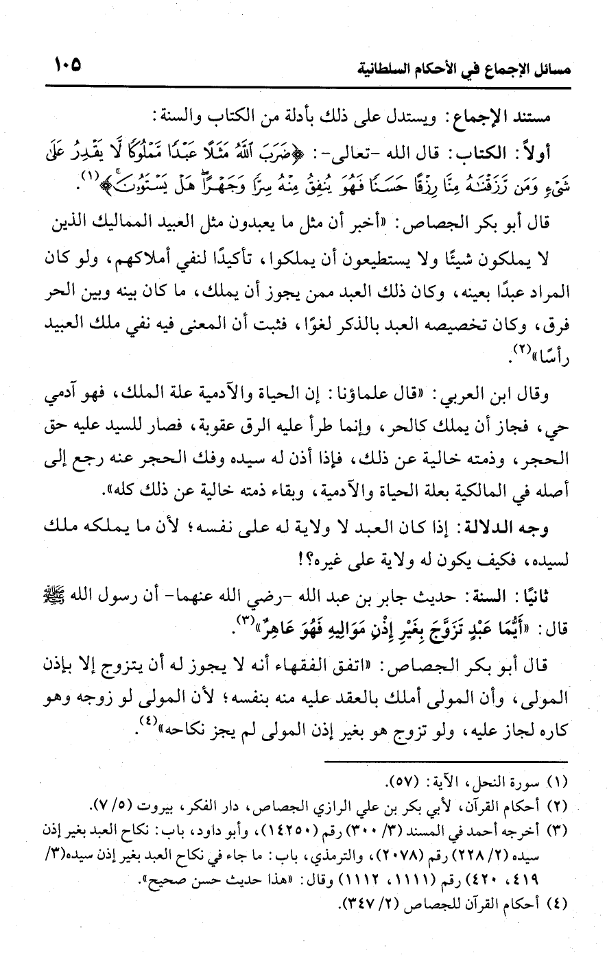 • ثانيًا: السنة: حديث جابر بن عبد اللَّه-رضي اللَّه عنهما- أن رسول اللَّه -صلى اللَّه عليه وسلم- قال: "أَيُّمَا عَبْدٍ تَزَوَّجَ بِغَيْرِ إِذْنِ مَوَالِيهِ فَهُوَ عَاهِرٌ" (¬3).