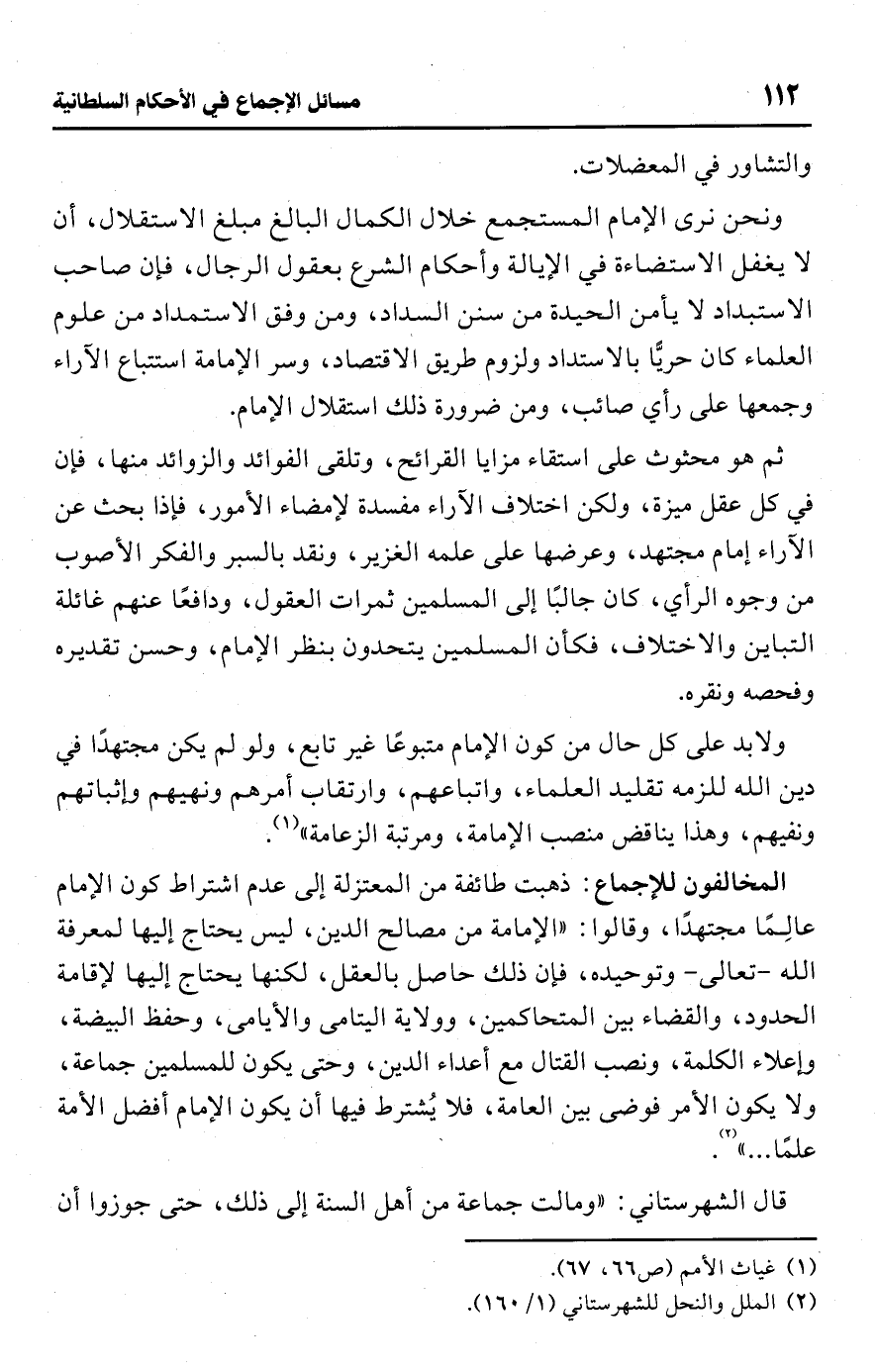 ونحن نرى الإمام المستجمع خلال الكمال البالغ مبلغ الاستقلال، أن لا يغفل الاستضاءة في الإيالة وأحكام الشرع بعقول الرجال، فإن صاحب الاستبداد لا يأمن الحيدة من سنن السداد، ومن وفق الاستمداد من علوم العلماء كان حريًّا بالاستداد ولزوم طريق الاقتصاد، وسر الإمامة استتباع الآراء وجمعها على رأي صائب، ومن ضرورة ذلك استقلال الإمام.