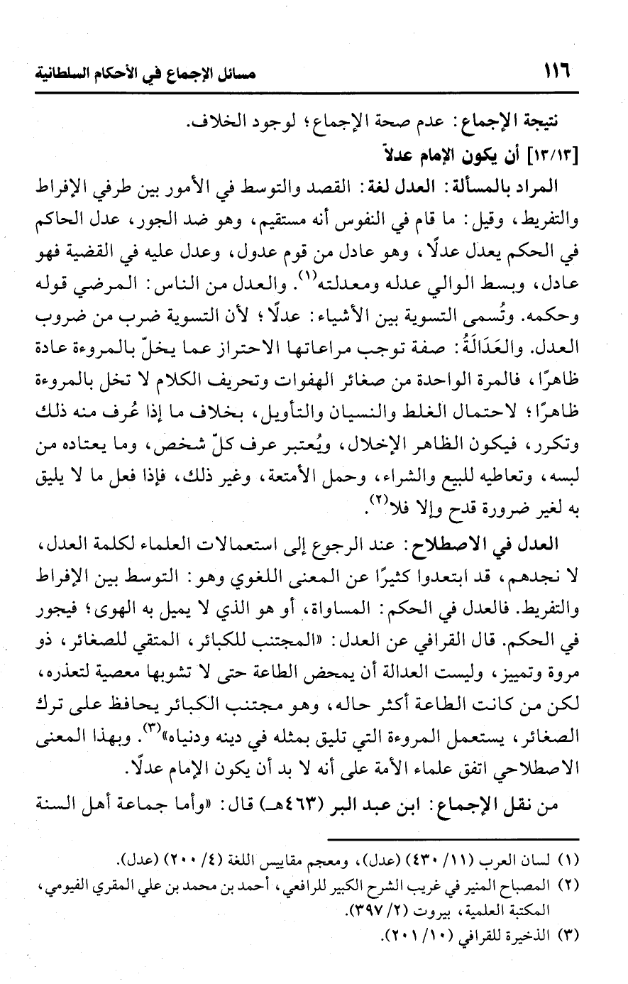 العدل في الاصطلاح: عند الرجوع إلى استعمالات العلماء لكلمة العدل، لا نجدهم، قد ابتعدوا كثيرًا عن المعنى اللغوي وهو: التوسط بين الإفراط والتفريط. فالعدل في الحكم: المساواة، أو هو الذي لا يميل به الهوى؛ فيجور في الحكم. قال القرافي عن العدل: "المجتنب للكبائر، المتقي للصغائر، ذو مروة وتمييز، وليست العدالة أن يمحض الطاعة حتى لا تشوبها معصية لتعذره، لكن من كانت الطاعة أكثر حاله، وهو مجتنب الكبائر يحافظ على ترك الصغائر، يستعمل المروءة التي تليق بمثله في دينه ودنياه" (¬3). وبهذا المعنى الاصطلاحي اتفق علماء الأمة على أنه لا بد أن يكون الإمام عدلًا.