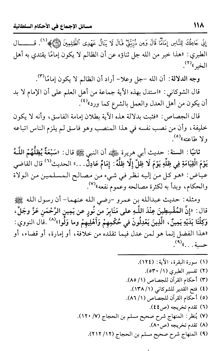 • ثانيًا: السنة: حديث أبي هريرة -رضي اللَّه عنه- أن النبي -صلى اللَّه عليه وسلم- قال: "سَبْعَةٌ يُظِلُّهُمْ اللَّهُ يَوْمَ الْقِيَامَةِ فِي ظِلِّهِ يَوْمَ لَا ظِلَّ إِلَّا ظِلُّهُ: إِمَامٌ عَادِلٌ. . . " الحديث (¬6) قال القاضي عياض: "هو كل من إليه نظر في شيء من مصالح المسلمين من الولاة والحكام، وبدأ به لكثرة مصالحه وعموم نفعه" (¬7).