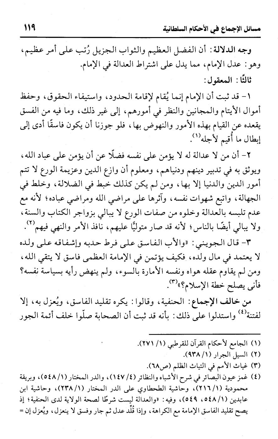 3 - قال الجويني: "والأب الفاسق على فرط حدبه وإشفاقه على ولده لا يعتمد في مال ولده، فكيف يؤتمن في الإمامة العظمى فاسق لا يتقي اللَّه، ومن لم يقاوم عقله هواه ونفسه الأمارة بالسوء، ولم ينهض رأيه بسياسة نفسه؟ فأنى يصلح خطة الإسلام؟ " (¬3).