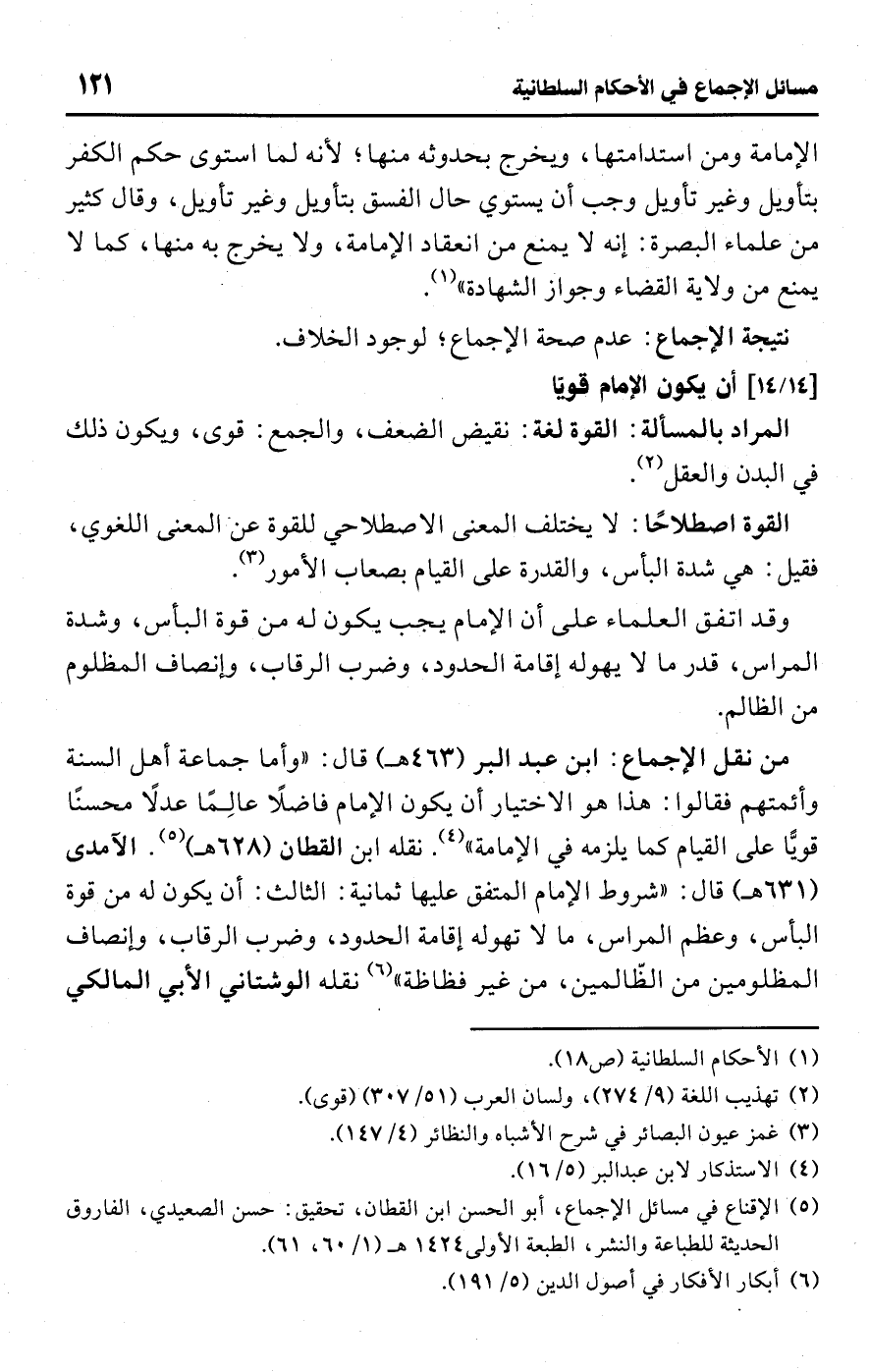 • من نقل الإجماع: ابن عبد البر (463 هـ) قال: "وأما جماعة أهل السنة وأئمتهم فقالوا: هذا هو الاختيار أن يكون الإمام فاضلًا عالِمًا عدلًا محسنًا قويًّا على القيام كما يلزمه في الإمامة" (¬4). نقله ابن القطان (628 هـ) (¬5). الآمدى (631 هـ) قال: "شروط الإمام المتفق عليها ثمانية: الثالث: أن يكون له من قوة البأس، وعظم المراس، ما لا تهوله إقامة الحدود، وضرب الرقاب، وإنصاف المظلومين من الظّالمين، من غير فظاظة" (¬6) نقله الوشتاني الأبي المالكي
