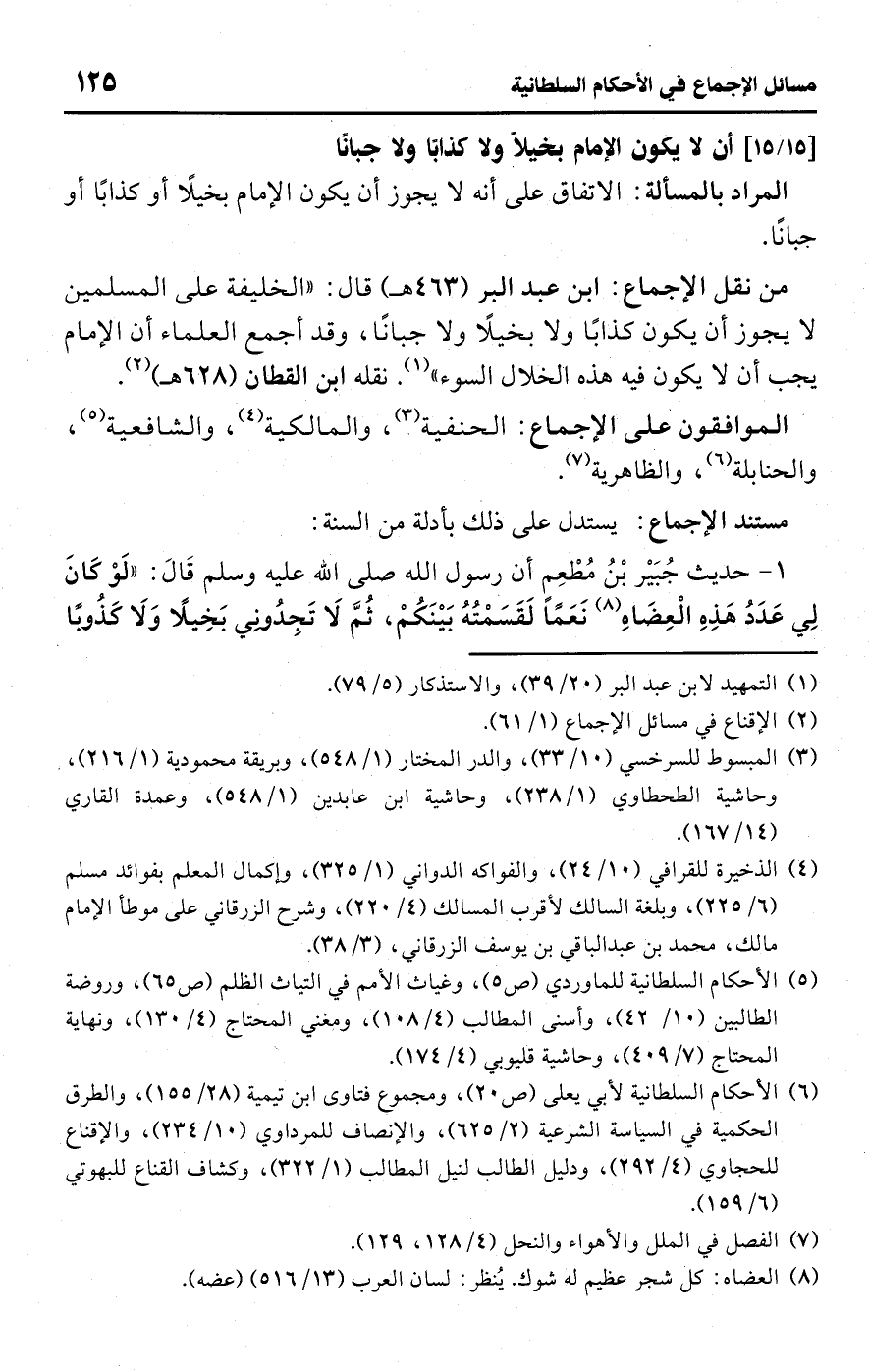 • من نقل الإجماع: ابن عبد البر (463 هـ) قال: "الخليفة على المسلمين لا يجوز أن يكون كذابًا ولا بخيلًا ولا جبانًا، وقد أجمع العلماء أن الإمام يجب أن لا يكون فيه هذه الخلال السوء" (¬1). نقله ابن القطان (628 هـ) (¬2).
