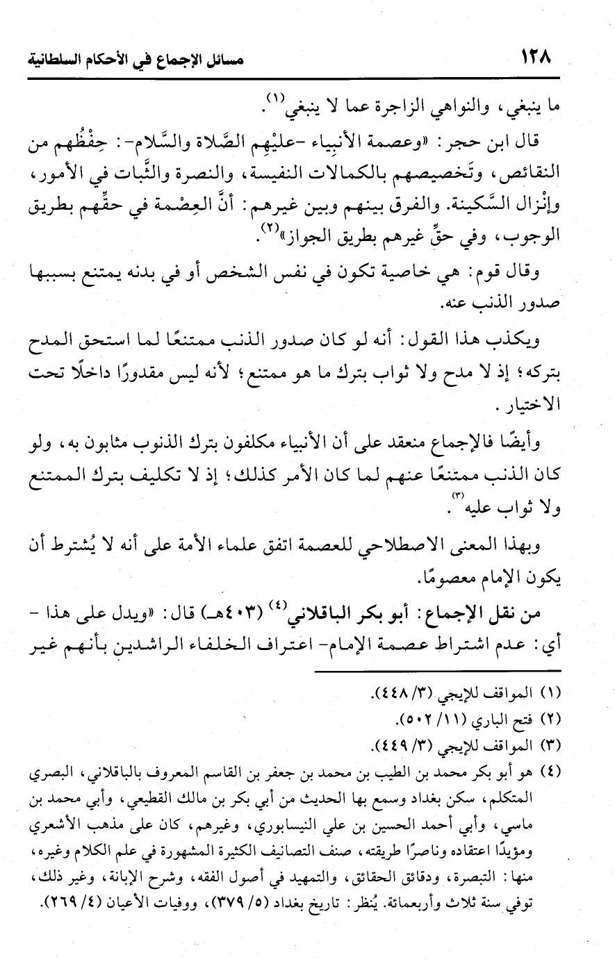 • من نقل الإجماع: أبو بكر الباقلاني (¬4) (403 هـ) قال: "ويدل على هذا -أي: عدم اشتراط عصمة الإمام- اعتراف الخلفاء الراشدين بأنهم غير
