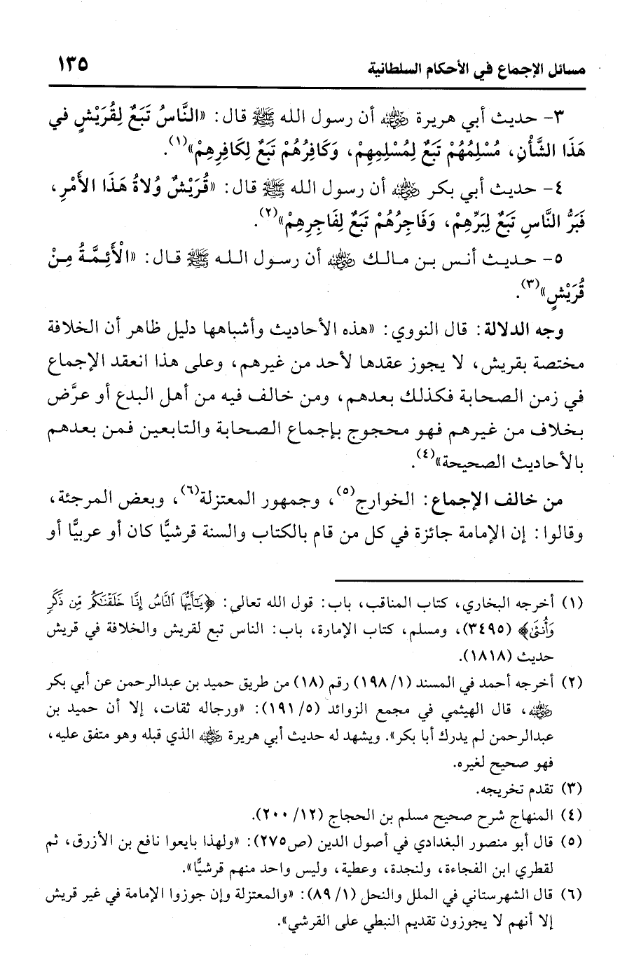 (¬6) قال الشهرستاني في الملل والنحل (1/ 89): "والمعتزلة وإن جوزوا الإمامة في غير قريش إلا أنهم لا يجوزون تقديم النبطي على القرشي".