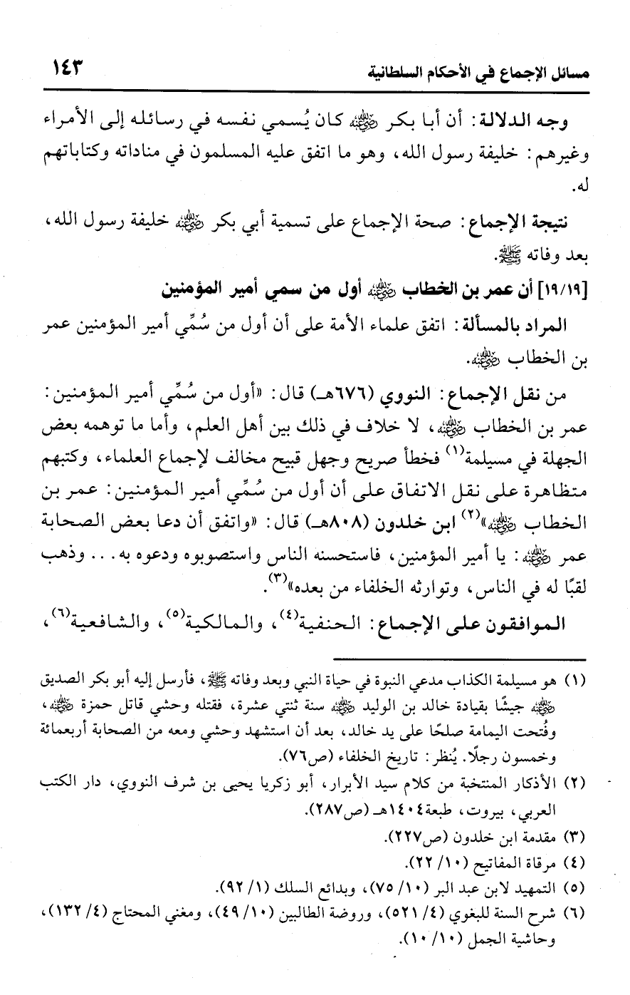 • من نقل الإجماع: النووي (676 هـ) قال: "أول من سُمِّي أمير المؤمنين: عمر بن الخطاب -رضي اللَّه عنه-، لا خلاف في ذلك بين أهل العلم، وأما ما توهمه بعض الجهلة في مسيلمة (¬1) فخطأ صريح وجهل قبيح مخالف لإجماع العلماء، وكتبهم متظاهرة على نقل الاتفاق على أن أول من سُمِّي أمير المؤمنين: عمر بن الخطاب -رضي اللَّه عنه-" (¬2) ابن خلدون (808 هـ) قال: "واتفق أن دعا بعض الصحابة عمر -رضي اللَّه عنه-: يا أمير المؤمنين، فاستحسنه الناس واستصوبوه ودعوه به. . . وذهب لقبًا له في الناس، وتوارثه الخلفاء من بعده" (¬3).