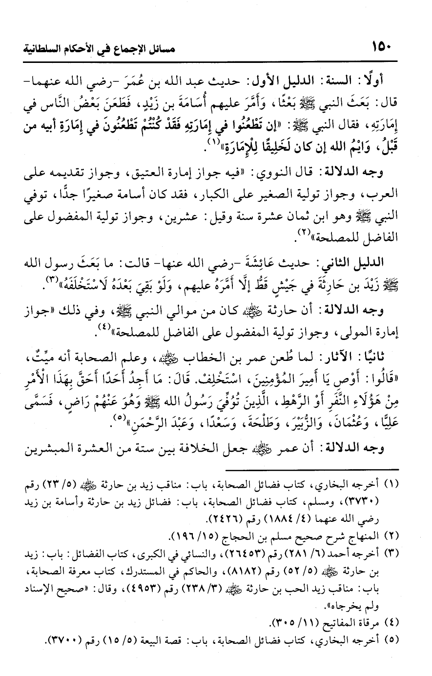 • أولًا: السنة: الدليل الأول: حديث عبد اللَّه بن عُمَرَ -رضي اللَّه عنهما- قال: بَعَثَ النبي -صلى اللَّه عليه وسلم- بَعْثًا، وَأَمَّرَ عليهم أُسَامَةَ بن زَيْدٍ، فَطَعَنِ بَعْضُ الناس في إِمَارَتِهِ، فقال النبي -صلى اللَّه عليه وسلم-: "إن تَطْعُنُوا في إِمَارَتِهِ فَقَدْ كُنْتُمْ تَطْعُنُون في إِمَارَةِ أبيه من قَبْلُ، وَايْمُ اللَّه إن كان لَخَلِيقًا لِلْإِمَارَةِ" (¬1).