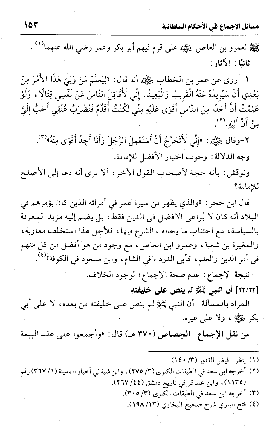 قال ابن حجر: "والذي يظهر من سيرة عمر في أمرائه الذين كان يؤمرهم في البلاد أنه كان لا يُراعي الأفضل في الدين فقط، بل يضم إليه مزيد المعرفة بالسياسة، مع اجتناب ما يخالف الشرع فيها، فلأجل هذا استخلف معاوية، والمغيرة بن شعبة، وعمرو ابن العاص، مع وجود من هو أفضل من كل منهم في أمر الدين والعلم، كأبي الدرداء في الشام، وابن مسعود في الكوفة" (¬4).Rعدم صحة الإجماع، لوجود الخلاف.