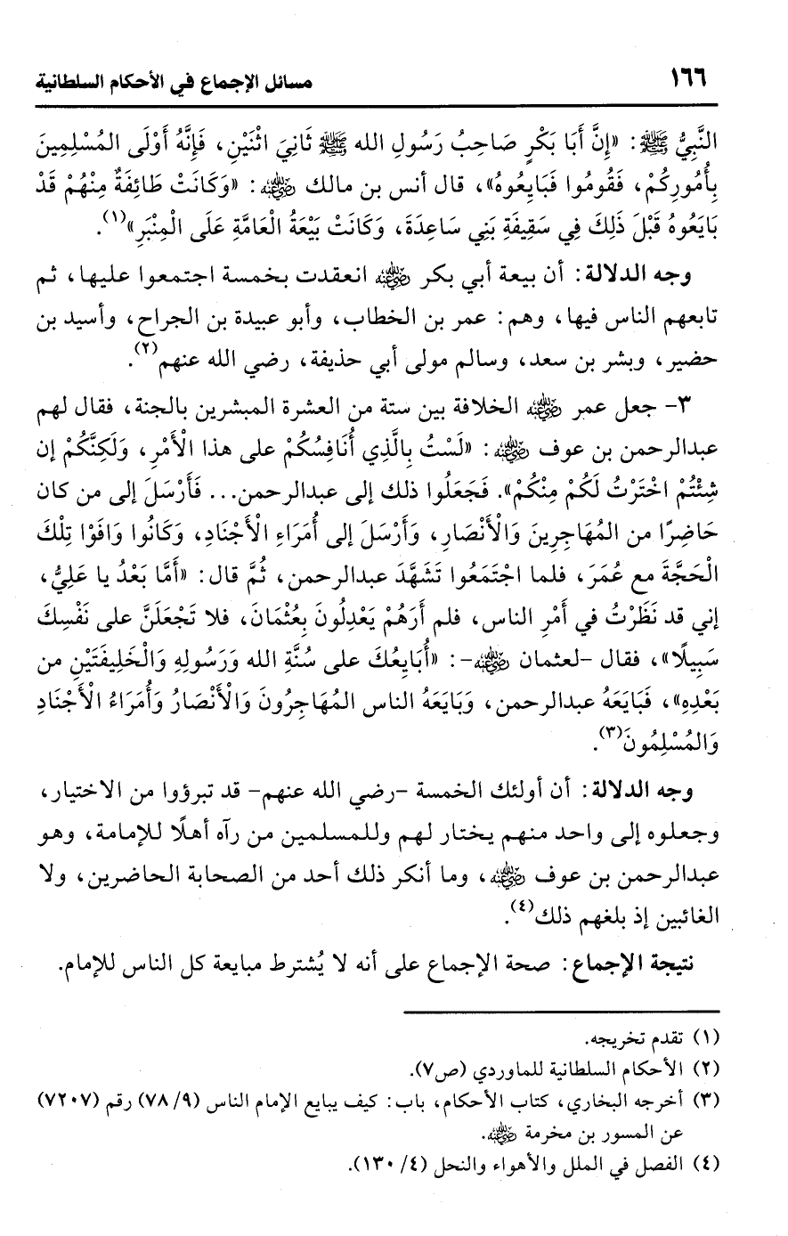 • وجه الدلالة: أن أولئك الخمسة -رضي اللَّه عنهم- قد تبرؤوا من الاختيار، وجعلوه إلى واحد منهم يختار لهم وللمسلمين من رآه أهلًا للإمامة، وهو عبد الرحمن بن عوف -رضي اللَّه عنه-، وما أنكر ذلك أحد من الصحابة الحاضرين، ولا الغائبين إذ بلغهم ذلك (¬4).Rصحة الإجماع على أنه لا يُشترط مبايعة كل الناس للإمام.