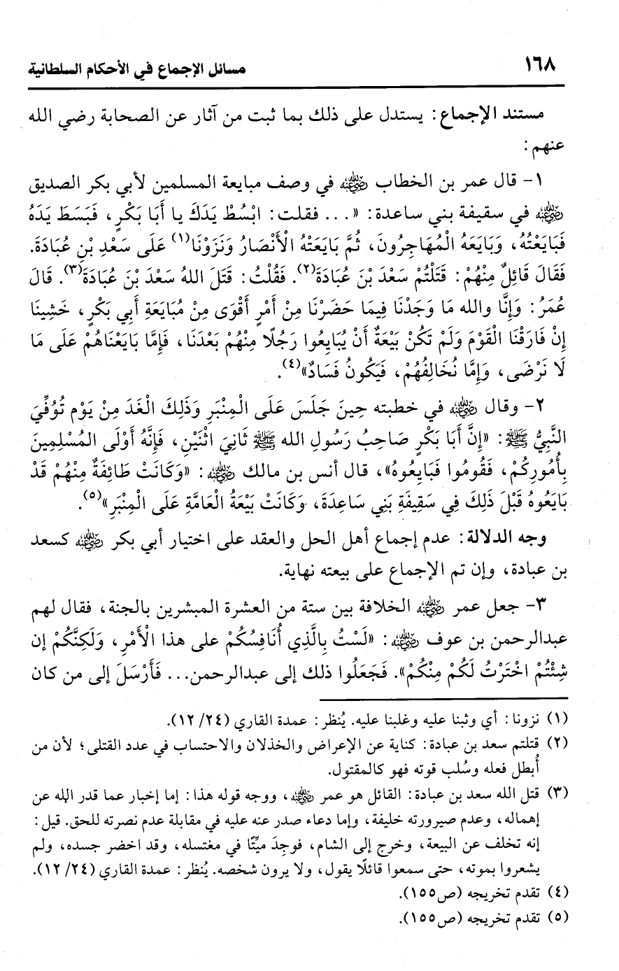 1 - قال عمر بن الخطاب -رضي اللَّه عنه- في وصف مبايعة المسلمين لأبي بكر الصديق -رضي اللَّه عنه- في سقيفة بني ساعدة: ". . . فقلت: ابْسُطْ يَدَكَ يا أَبَا بَكْرٍ، فَبَسَطَ يَدَهُ فَبَايَعْتُهُ، وَبَايَعَهُ الْمُهَاجِرُونَ، ثُمَّ بَايَعَتْهُ الْأَنْصَارُ وَنَزَوْنَا (¬1) عَلَى سَعْدِ بْن عُبَادَةَ. فَقَالَ قَائِلٌ مِنْهُمْ: قَتَلْتُمْ سَعْدَ بْنَ عُبَادَةَ (¬2). فَقُلْتُ: قَتَلَ اللَّهُ سَعْدَ بْنَ عُبَادَةَ (¬3). قَالَ عُمَرُ: وَإِنَّا واللَّه مَا وَجَدْنَا فِيمَا حَضَرْنَا مِنْ أَمْرٍ أَقْوَى مِنْ مُبَايَعَةِ أَبِي بَكْرٍ، خَشِينَا إِنْ فَارَقْنَا الْقَوْمَ وَلَمْ تَكُنْ بَيْعَةٌ أَنْ يُبَايِعُوا رَجُلًا مِنْهُمْ بَعْدَنَا، فَإِمَّا بَايَعْنَاهُمْ عَلَى مَا لَا نَرْضَى، وَإِمَّا نُخَالِفُهُمْ، فَيَكُونُ فَسَادٌ" (¬4).