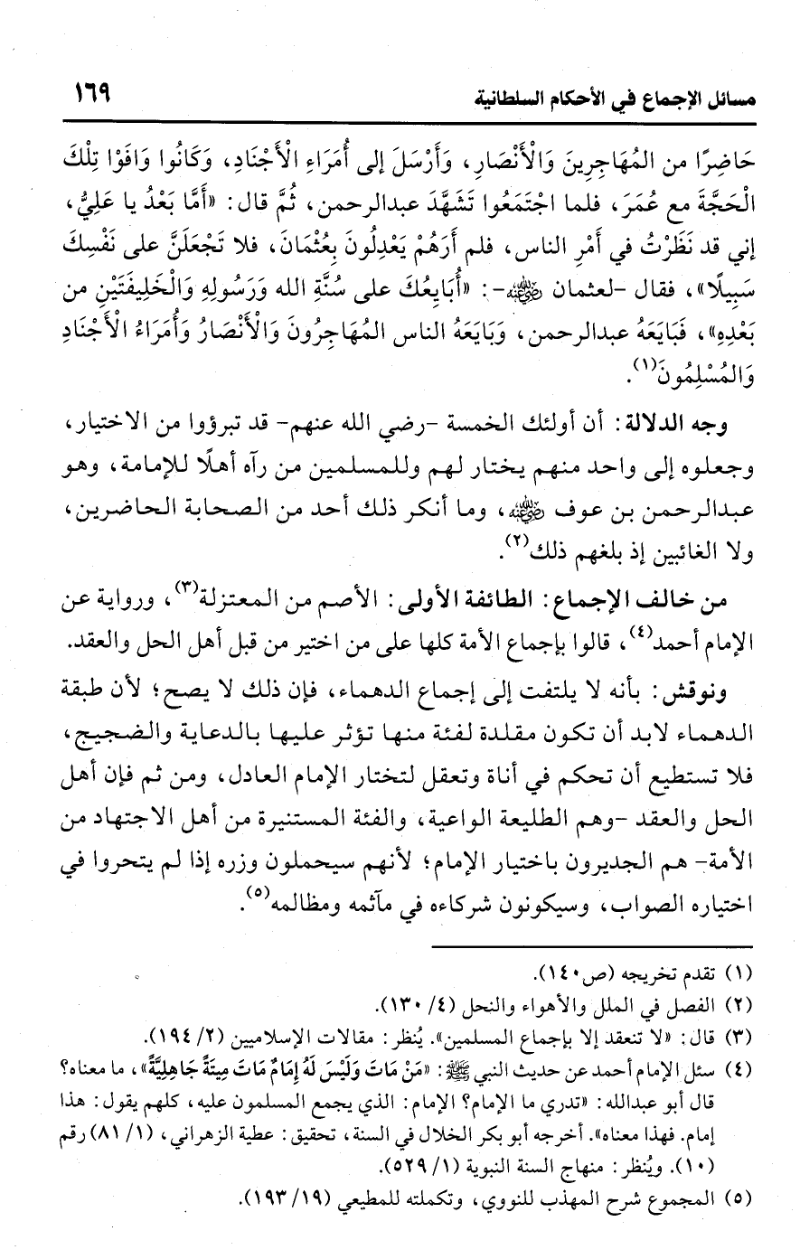 (¬4) سئل الإمام أحمد عن حديث النبي -صلى اللَّه عليه وسلم-: "مَنْ مَاتَ وَلَيْسَ لَهُ إِمَامٌ مَاتَ مِيتَةً جَاهِلِيَّةً"، ما معناه؟ قال أبو عبد اللَّه: "تدري ما الإمام؟ الإمام: الذي يجمع المسلمون عليه، كلهم يقول: هذا إمام. فهذا معناه". أخرجه أبو بكر الخلال في السنة، تحقيق: عطية الزهراني، (1/ 81) رقم (10). ويُنظر: منهاج السنة النبوية (1/ 529).