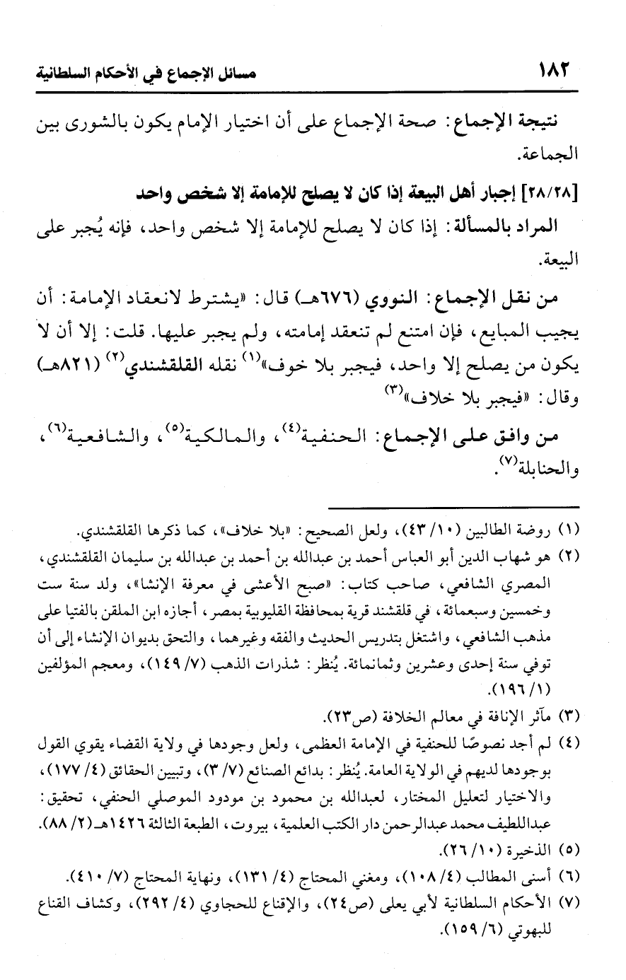 • من نقل الإجماع: النووي (676 هـ) قال: "يشترط لانعقاد الإمامة: أن يجيب المبايع، فإن امتنع لم تنعقد إمامته، ولم يجبر عليها. قلت: إلا أن لا يكون من يصلح إلا واحد، فيجبر بلا خوف" (¬1) نقله القلقشندي (¬2) (821 هـ) وقال: "فيجبر بلا خلاف" (¬3)