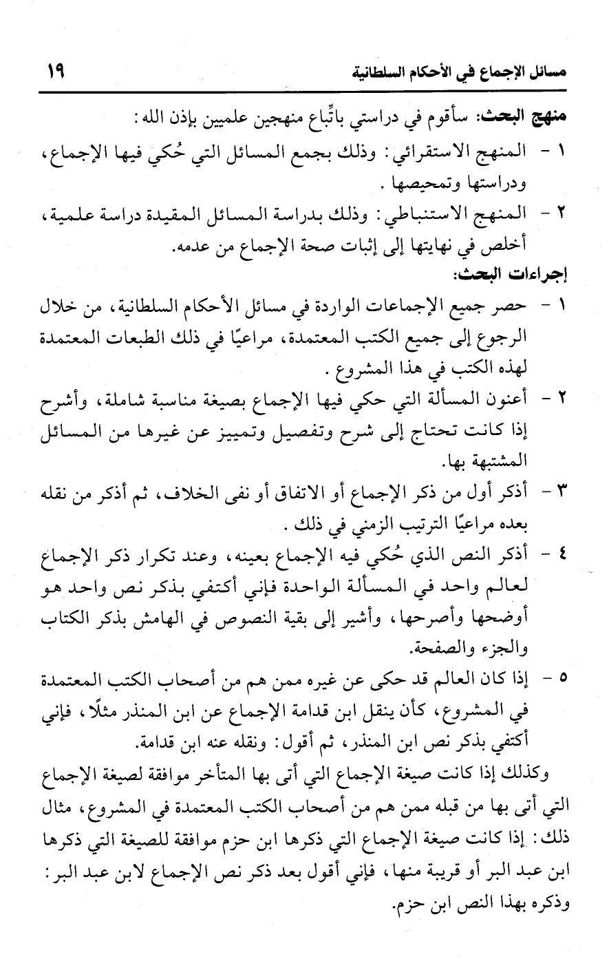 1 - حصر جميع الإجماعات الواردة في مسائل الأحكام السلطانية، من خلال الرجوع إلى جميع الكتب المعتمدة، مراعيًا في ذلك الطبعات المعتمدة لهذه الكتب في هذا المشروع.