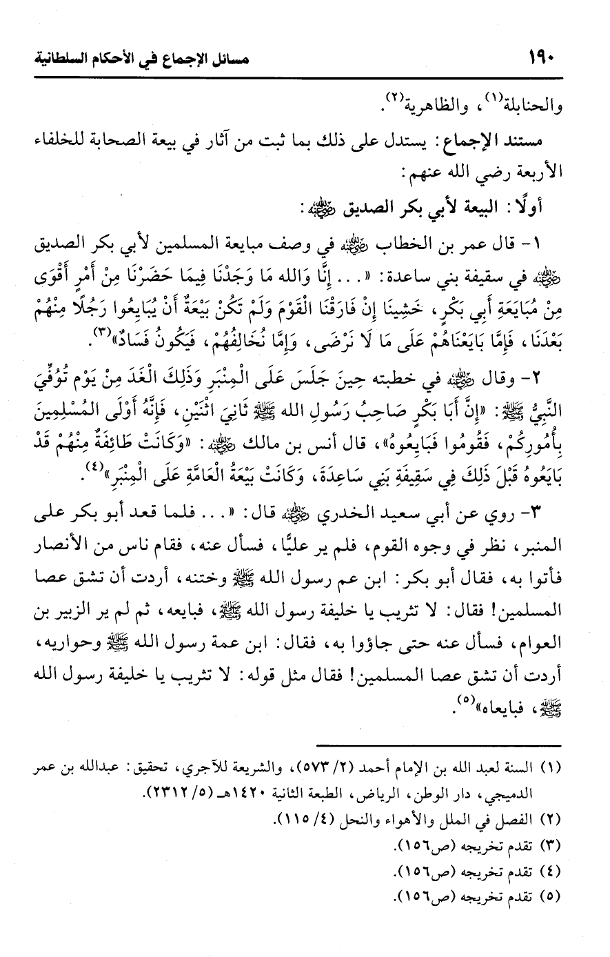 1 - قال عمر بن الخطاب -رضي اللَّه عنه- في وصف مبايعة المسلمين لأبي بكر الصديق -رضي اللَّه عنه- في سقيفة بني ساعدة: ". . . إِنَّا وَاللَّه مَا وَجَدْنَا فِيمَا حَضرْنَا مِنْ أَمْرٍ أَقْوَى مِنْ مُبَايَعَةِ أَبِي بَكْرٍ، خَشِينَا إِنْ فَارَقْنَا الْقَوْمَ وَلَمْ تَكُنْ بَيْعَةٌ أَنْ يُبَايِعُوا رَجُلًا مِنْهُمْ بَعْدَنَا، فَإِمَّا بَايَعْنَاهُمْ عَلَى مَا لَا نَرْضَى، وَإِمَّا نُخَالِفُهُمْ، فَيَكُونُ فَسَادٌ" (¬3).