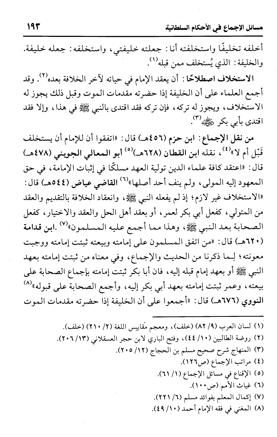 • من نقل الإجماع: ابن حزم (456 هـ) قال: "اتفقوا أن للإمام أن يستخلف قَبْل أم لا" (¬4)، نقله ابن القطان (628 هـ) (¬5) أبو المعالي الجويني (478 هـ) قال: "اعتقد كافة علماء الدين تولية العهد مسلكًا في إثبات الإمامة، في حق المعهود إليه المولى، ولم ينف أحد أصلها" (¬6) القاضي عياض (544 هـ) قال: "الاستخلاف غير لازم؛ إذ لم يفعله النبي -صلى اللَّه عليه وسلم-، وانعقاد الخلافة بالتقديم والعقد من المتولي، كفعل أبي بكر لعمر، أو بعقد أهل الحل والعقد والاختيار، كفعل الصحابة بعد النبي -صلى اللَّه عليه وسلم-، وهذا مما أجمع عليه المسلمون" (¬7). ابن قدامة (620 هـ) قال: "من اتفق المسلمون على إمامته وبيعته ثبتت إمامته ووجبت معونته؛ لِما ذكرنا من الحديث والإجماع، وفي معناه من ثبتت إمامته بعهد النبي -صلى اللَّه عليه وسلم- أو بعهد إمام قبله إليه، فإن أبا بكر ثبتت إمامته بإجماع الصحابة على بيعته، وعمر ثبتت إمامته بعهد أبي بكر إليه، وأجمع الصحابة على قبوله" (¬8) النووي (676 هـ) قال: "أجمعوا على أن الخليفة إذا حضرته مقدمات الموت
