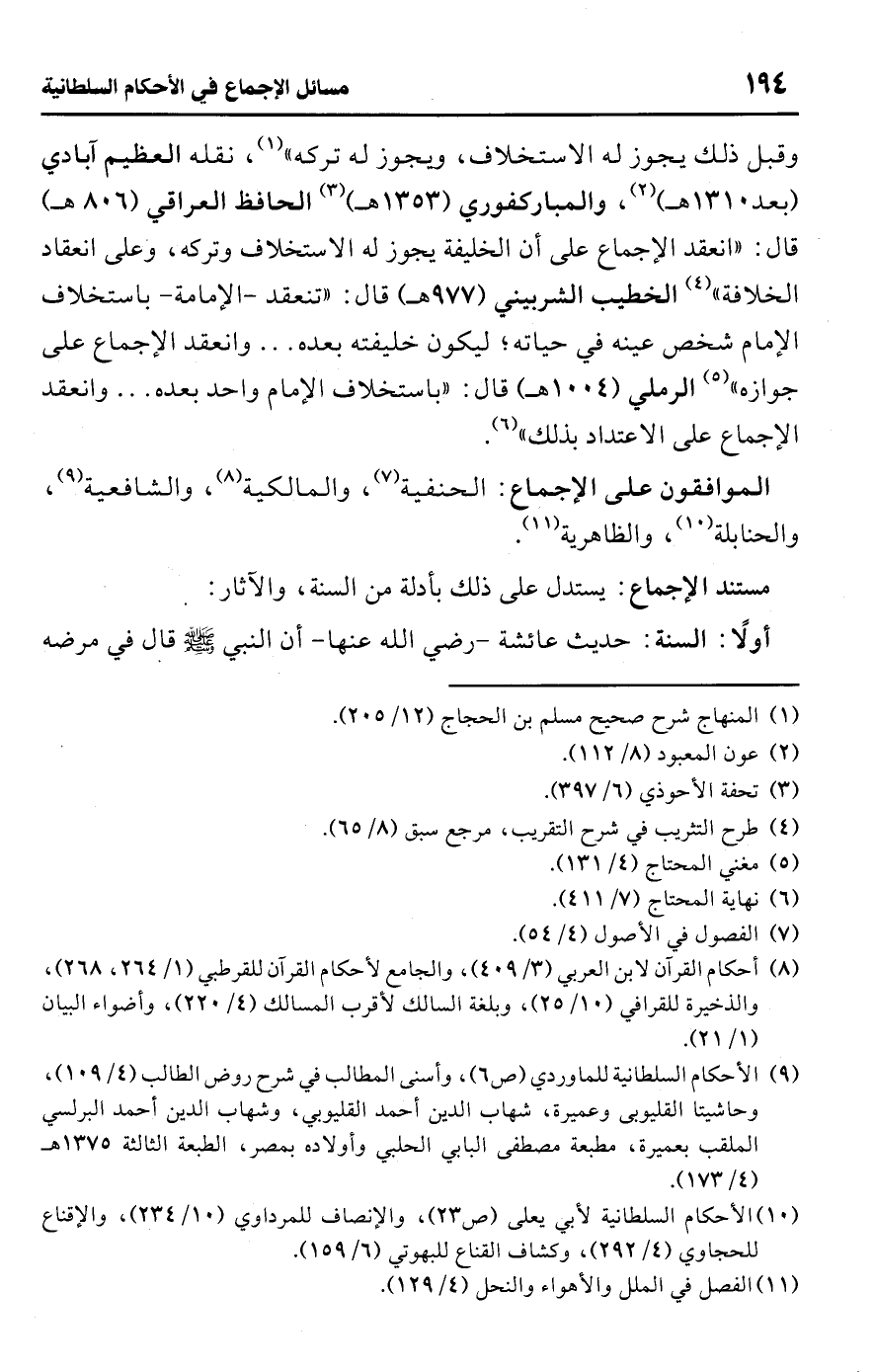 (¬9) الأحكام السلطانية للماوردي (ص 6)، وأسنى المطالب في شرح روض الطالب (4/ 109)، وحاشيتا القليوبى وعميرة، شهاب الدين أحمد القليوبي، وشهاب الدين أحمد البرلسي الملقب بعميرة، مطبعة مصطفى البابي الحلبي وأولاده بمصر، الطبعة الثالثة 1375 هـ (4/ 173).