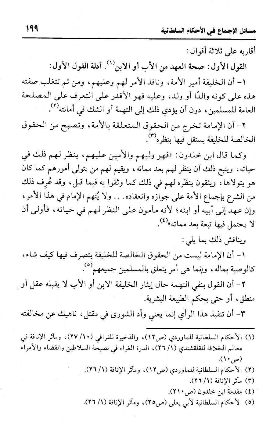 (¬1) الأحكام السلطانية للماوردي (ص 12)، والذخيرة للقرافي (10/ 27)، ومآثر الإنافة في معالم الخلافة للقلقشندي (1/ 26)، الدرة الغراء في نصيحة السلاطين والقضاء والأمراء (ص 10).