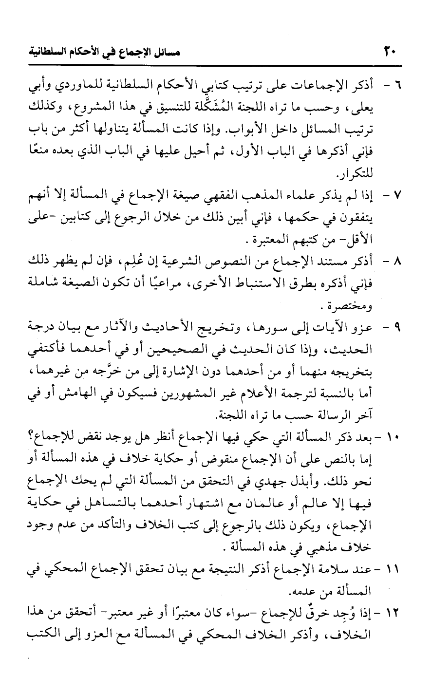 6 - أذكر الإجماعات على ترتيب كتابي الأحكام السلطانية للماوردي وأبي يعلى، وحسب ما تراه اللجنة المُشَكَلة للتنسيق في هذا المشروع، وكذلك ترتيب المسائل داخل الأبواب. وإذا كانت المسألة يتناولها أكثر من باب فإني أذكرها في الباب الأول، ثم أحيل عليها في الباب الذي بعده منعًا للتكرار.