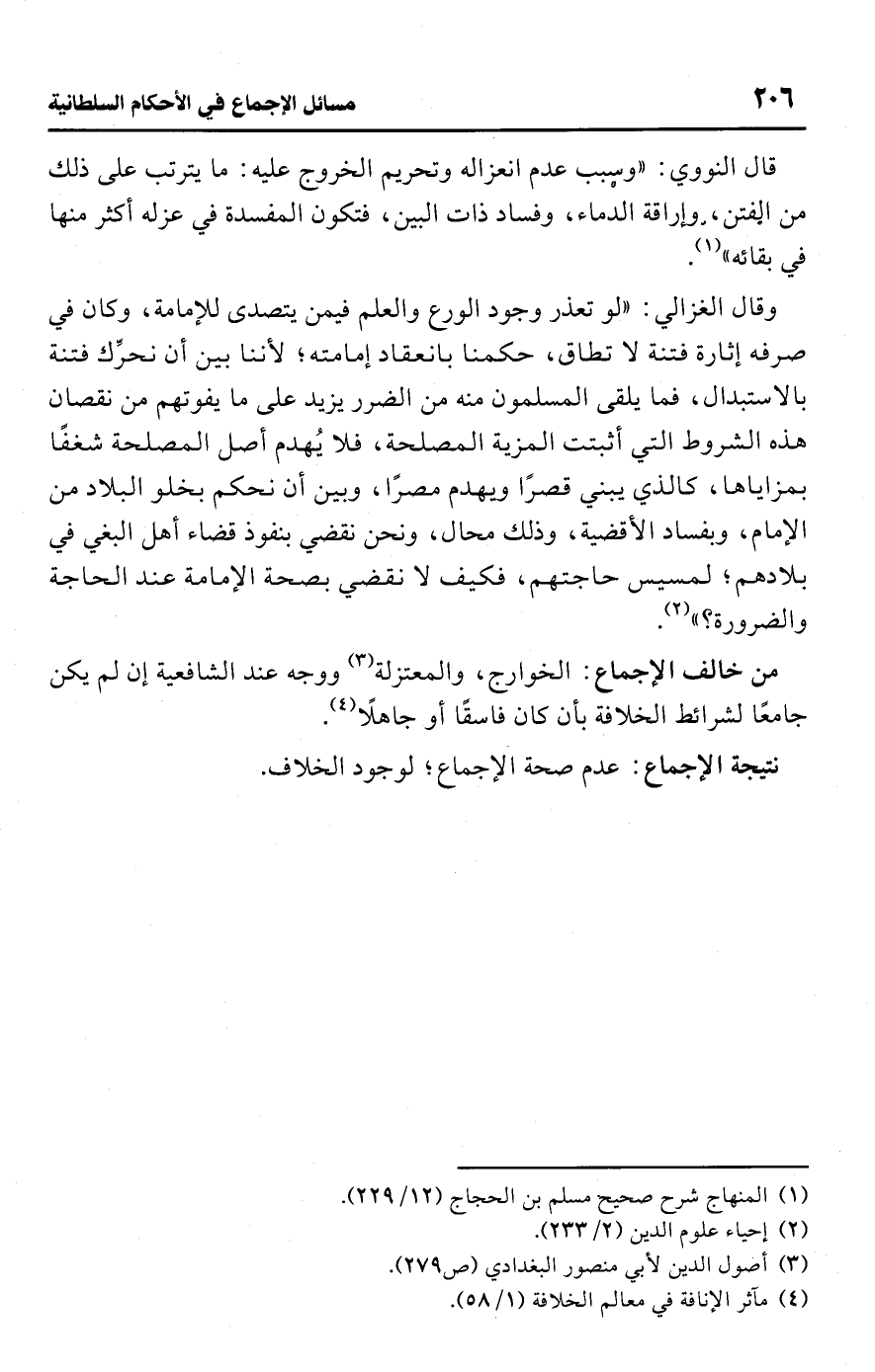 وقال الغزالي: "لو تعذر وجود الورع والعلم فيمن يتصدى للإمامة، وكان في صرفه إثارة فتنة لا تطاق، حكمنا بانعقاد إمامته؛ لأننا بين أن نحرِّك فتنة بالاستبدال، فما يلقى المسلمون منه من الضرر يزيد على ما يفوتهم من نقصان هذه الشروط التي أثبتت المزية المصلحة، فلا يُهدم أصل المصلحة شغفًا بمزاياها، كالذي يبني قصرًا ويهدم مصرًا، وبين أن نحكم بخلو البلاد من الإمام، وبفساد الأقضية، وذلك محال، ونحن نقضي بنفوذ قضاء أهل البغي في بلادهم؛ لمسيس حاجتهم، فكيف لا نقضي بصحة الإمامة عند الحاجة والضرورة؟ " (¬2).