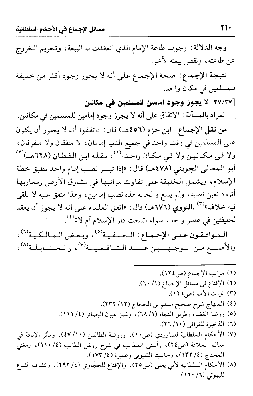 • من نقل الإجماع: ابن حزم (456 هـ) قال: "اتفقوا أنه لا يجوز أن يكون على المسلمين في وقت واحد في جميع الدنيا إمامان، لا متفقان ولا متفرقان، ولا في مكانين ولا في مكان واحد" (¬1)، نقله ابن القطان (628 هـ) (¬2) أبو المعالي الجويني (478 هـ) قال: "إذا تيسر نصب إمام واحد يطبق خطة الإسلام، ويشمل الخليقة على تفاوت مراتبها في مشارق الأرض ومغاربها أثره؛ تعين نصبه، ولم يسع والحالة هذه نصب إمامين، وهذا متفق عليه لا يلقى فيه خلاف" (¬3). النووي (676 هـ) قال: "اتفق العلماء على أنه لا يجوز أن يعقد لخليفتين في عصر واحد، سواء اتسعت دار الإسلام أم لا" (¬4).