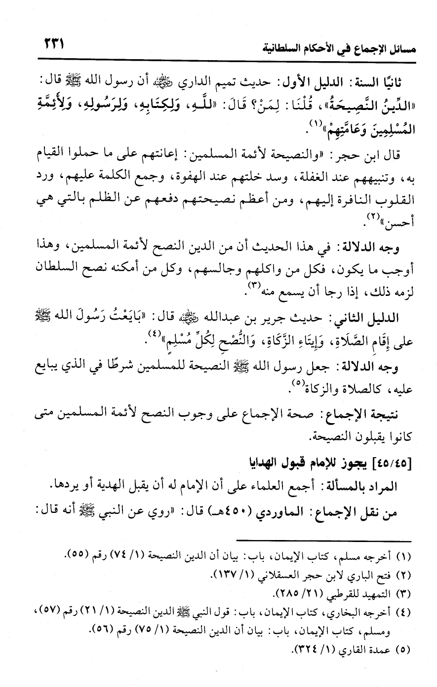 • وجه الدلالة: جعل رسول اللَّه -صلى اللَّه عليه وسلم- النصيحة للمسلمين شرطًا في الذي يبايع عليه، كالصلاة والزكاة (¬5).Rصحة الإجماع على وجوب النصح لأئمة المسلمين متى كانوا يقبلون النصيحة.
