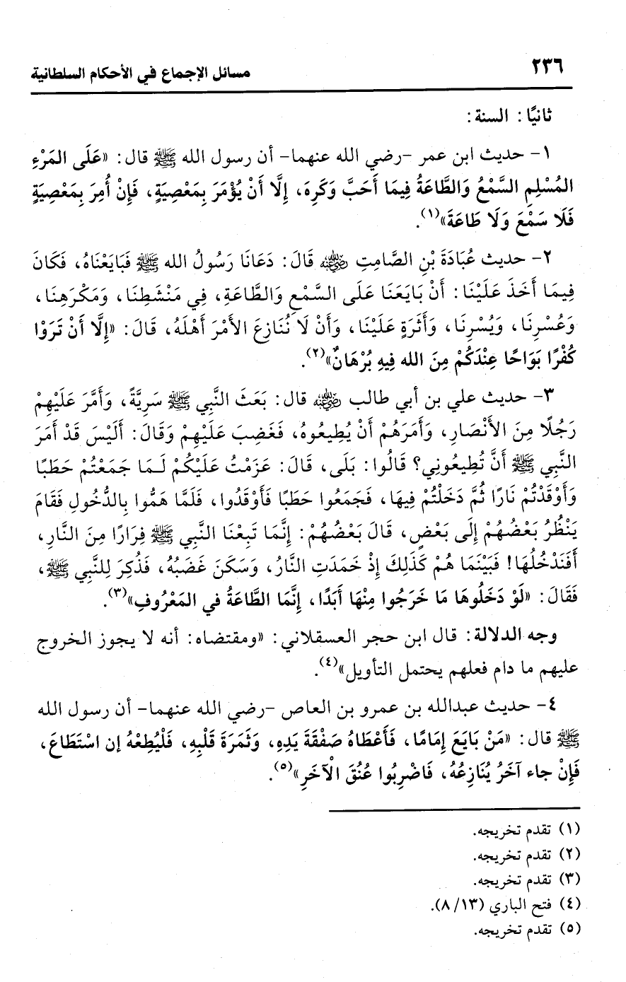 4 - حديث عبد اللَّه بن عمرو بن العاص -رضي اللَّه عنهما- أن رسول اللَّه -صلى اللَّه عليه وسلم- قال: "مَنْ بَايَعَ إِمَامًا، فَأَعْطَاهُ صَفْقَةَ يَدِهِ، وَثَمَرَةَ قَلْبِهِ، فَلْيُطِعْهُ إن اسْتَطَاعَ، فإنْ جاء آخَرُ يُنَازِعُهُ، فَاضْرِبُوا عُنُقَ الْآخَرِ" (¬5).