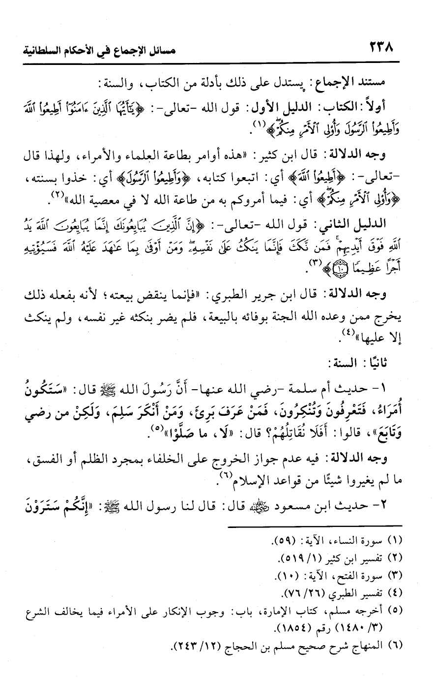 • وجه الدلالة: قال ابن كثير: "هذه أوامر بطاعة العلماء والأمراء، ولهذا قال -تعالى-: {أَطِيعُوا اللَّهَ} أي: اتبعوا كتابه، {وَأَطِيعُوا الرَّسُولَ} أي: خذوا بسنته، {وَأُولِي الْأَمْرِ مِنْكُمْ} أي: فيما أمروكم به من طاعة اللَّه لا في معصية اللَّه" (¬2).