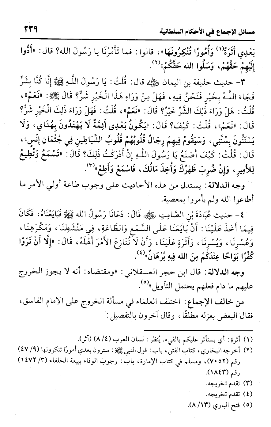 4 - حديث عُبَادَةَ بْنِ الصَّامِتِ -صلى اللَّه عليه وسلم- قَالَ: دَعَانَا رَسُولُ اللَّه -صلى اللَّه عليه وسلم- فَبَايَعْنَاهُ، فَكَانَ فِيمَا أَخَذَ عَلَيْنَا: أَنْ بَايَعَنَا عَلَى السَّمْعِ وَالطَّاعَةِ، فِي مَنْشَطِنَا، وَمَكْرَهِنَا، وَعُسْرِنَا، ويُسْرِنَا، وَأَثَرَةٍ عَلَيْنَا، وَأَنْ لَا نُنَازعَ الأَمْرَ أَهْلَهُ، قَالَ: "إِلَّا أَنْ تَرَوْا كُفْرًا بَوَاحًا عِنْدَكُمْ مِنَ اللَّه فِيهِ بُرْهَانٌ" (¬4).