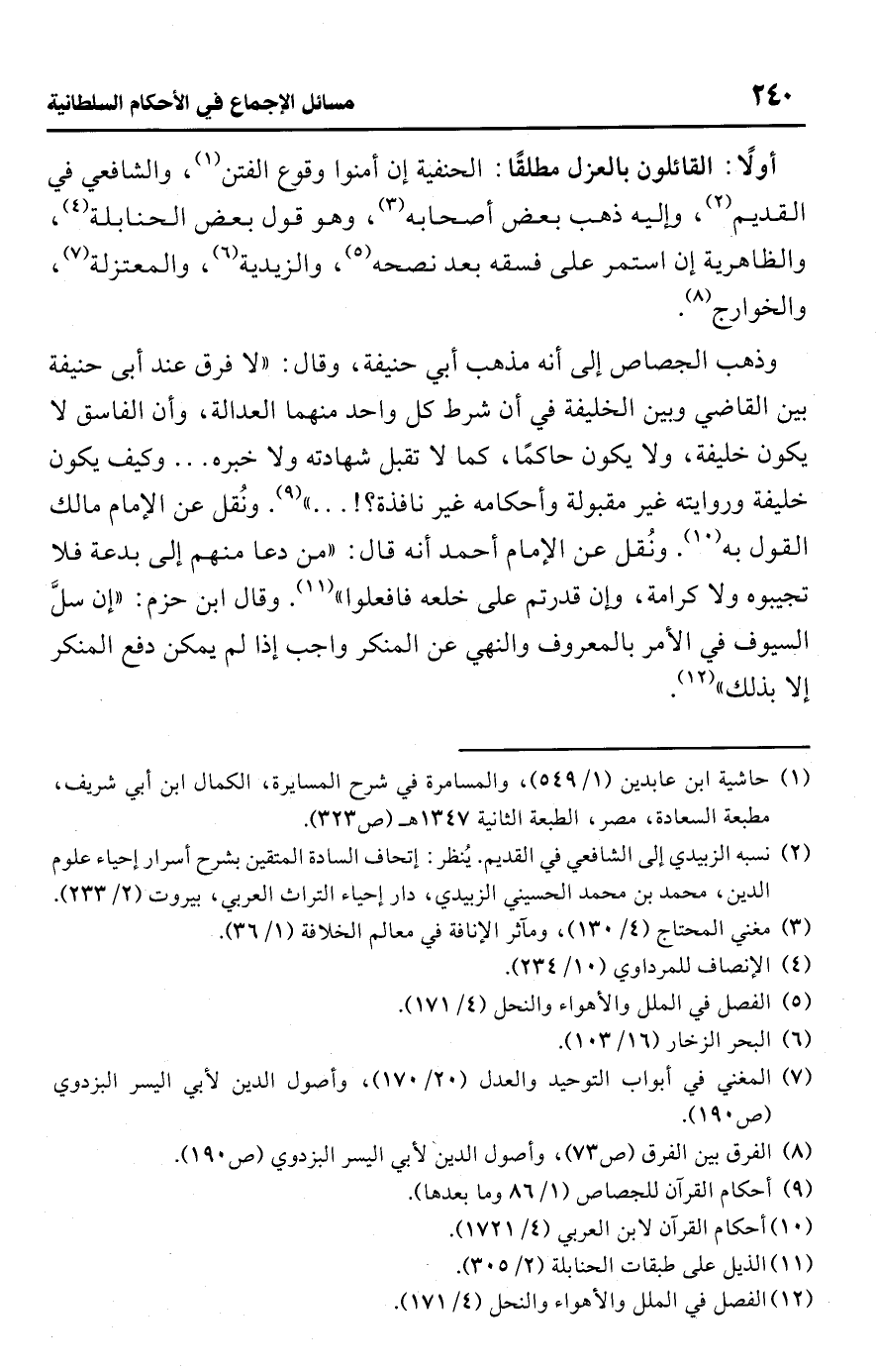وذهب الجصاص إلى أنه مذهب أبي حنيفة، وقال: "لا فرق عند أبى حنيفة بين القاضي وبين الخليفة في أن شرط كل واحد منهما العدالة، وأن الفاسق لا يكون خليفة، ولا يكون حاكمًا، كما لا تقبل شهادته ولا خبره. . . وكيف يكون خليفة وروايته غير مقبولة وأحكامه غير نافذة؟ ! . . . " (¬9). ونُقل عن الإمام مالك القول به (¬10). ونُقل عن الإمام أحمد أنه قال: "من دعا منهم إلى بدعة فلا تجيبوه ولا كرامة، وإن قدرتم على خلعه فافعلوا" (¬11). وقال ابن حزم: "إن سلَّ السيوف في الأمر بالمعروف والنهي عن المنكر واجب إذا لم يمكن دفع المنكر إلا بذلك" (¬12).