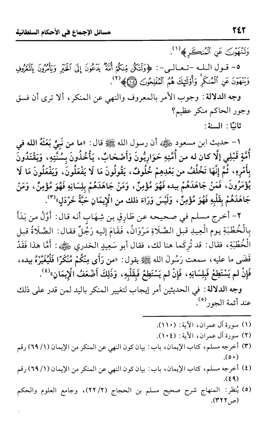 • وجه الدلالة: وجوب الأمر بالمعروف والنهي عن المنكر، ألا ترى أن فسق وجور الحاكم منكر عظيم؟