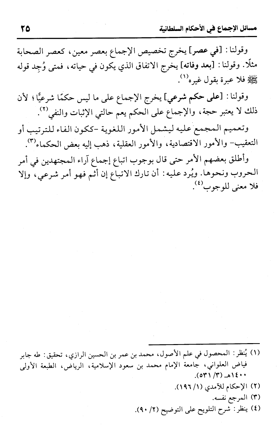(¬1) يُنظر: المحصول في علم الأصول، محمد بن عمر بن الحسين الرازي، تحقيق: طه جابر فياض العلواني، جامعة الإمام محمد بن سعود الإسلامية، الرياض، الطبعة الأولى 1400 هـ (3/ 531).