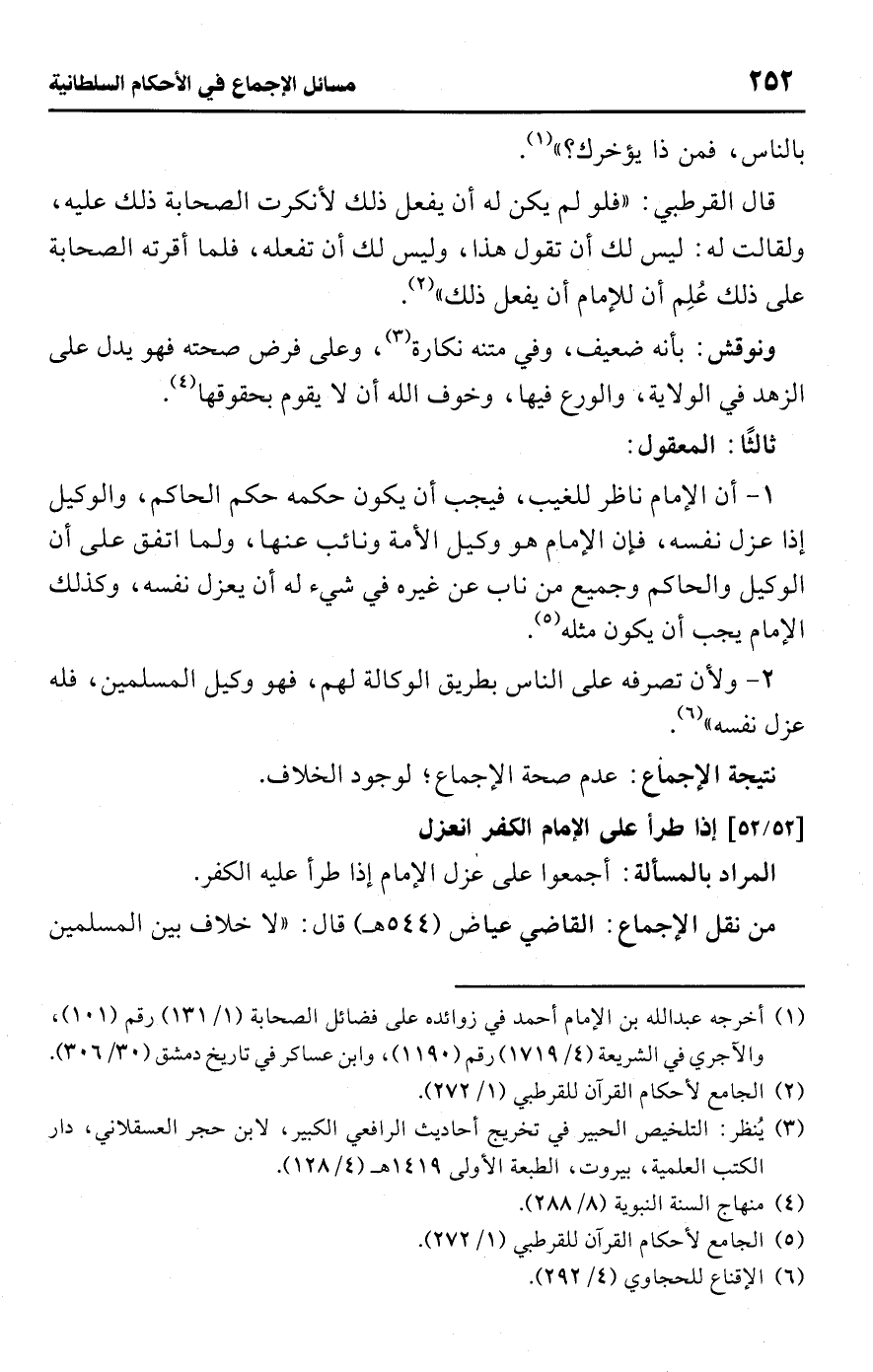 2 - ولأن تصرفه على الناس بطريق الوكالة لهم، فهو وكيل المسلمين، فله عزل نفسه" (¬6).Rعدم صحة الإجماع؛ لوجود الخلاف.