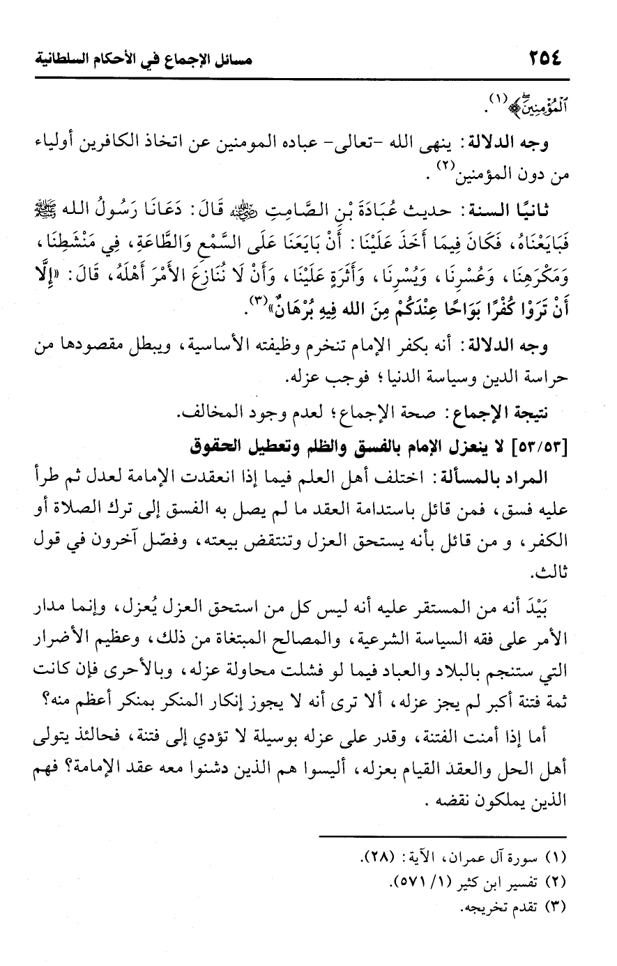 • وجه الدلالة: أنه بكفر الإمام تنخرم وظيفته الأساسية، ويبطل مقصودها من حراسة الدين وسياسة الدنيا؛ فوجب عزله.Rصحة الإجماع؛ لعدم وجود المخالف.