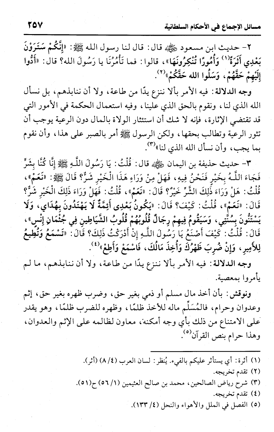 • وجه الدلالة: في الحديثين أمر إيجاب لتغيير المنكر باليد لمن قدر على ذلك عند أئمة الجور (¬3).